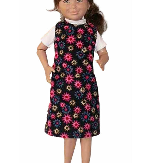 A-line jumper designed for 16" Hopscotch Hill dolls. Features a classic scoop neckline and deep armholes for easy dressing. Closes securely in back with Velcro fastening. Perfect for creating versatile outfits with coordinating tops and accessories.