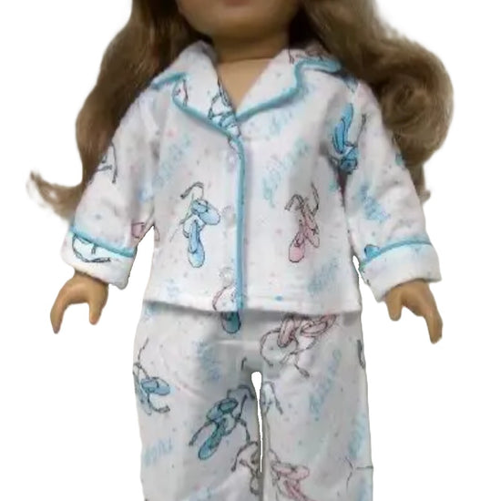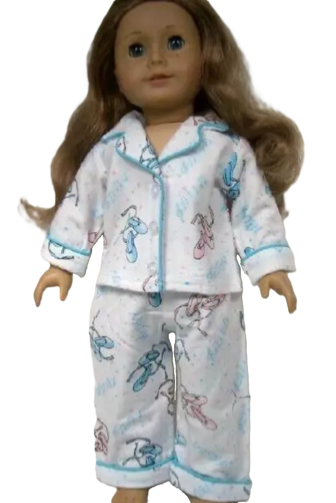 White flannel pajamas in a music & ballerina slippers print have blue trim.