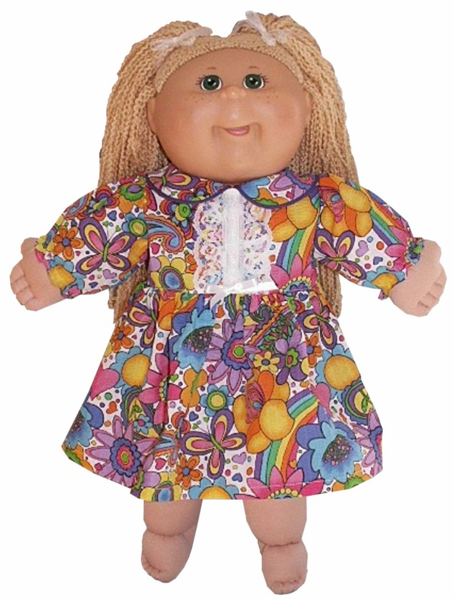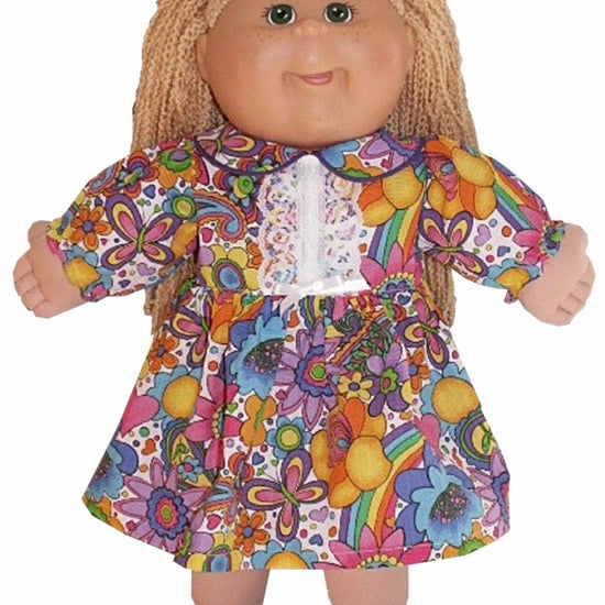 This charming eyelet lace dress is designed for 20" Cabbage Patch Kid dolls and features a sweet peter pan collar with decorative trim accenting the front bodice. Choose between short or long sleeves to match your doll's style. The back closure uses soft Velcro for easy dressing and undressing. Perfect for adding a touch of vintage-inspired elegance to your doll's wardrobe!