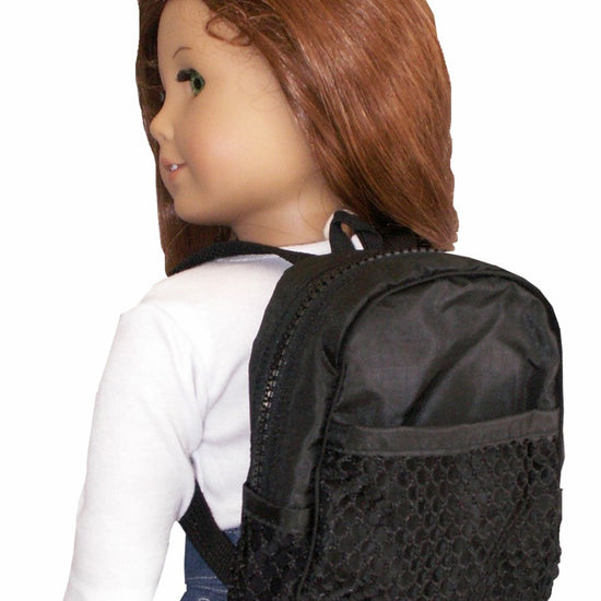 Classic and capable! This sleek black nylon backpack is the go-to accessory for your American Girl doll's everyday adventures. Built with a sturdy zipper and convenient side pockets, it's designed to handle all her on-the-go essentials. The timeless black finish pairs seamlessly with any outfit, making it perfect for school scenes, travel play, or outdoor expeditions. A versatile must-have for any doll's collection!