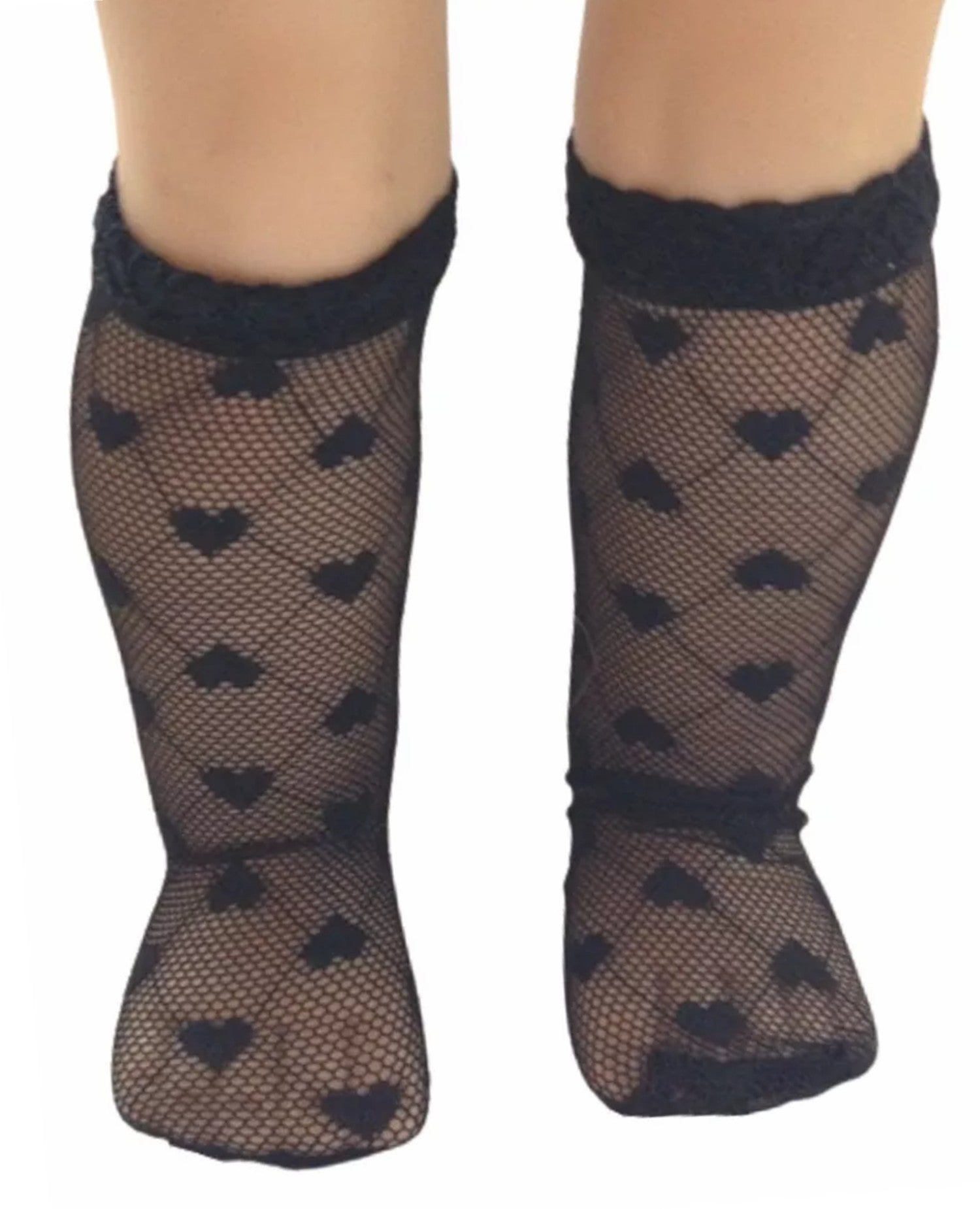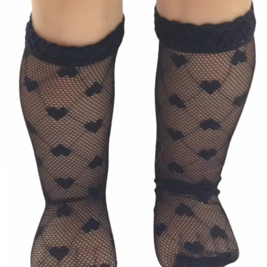 Black heart pattern mesh knee high socks fit most dolls 15-20" with average size feet.