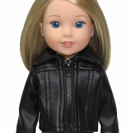 Give your WellieWishers doll an instant cool-girl upgrade with this sleek Black Leather Jacket! Crafted from soft faux leather with a functional zip closure, it's the perfect layer for any adventure. Whether she's heading out for a casual day or dressing up for something special, this timeless jacket adds edge and sophistication to her look. Compact and perfectly proportioned for smaller dolls, it's a wardrobe essential that works with everything!