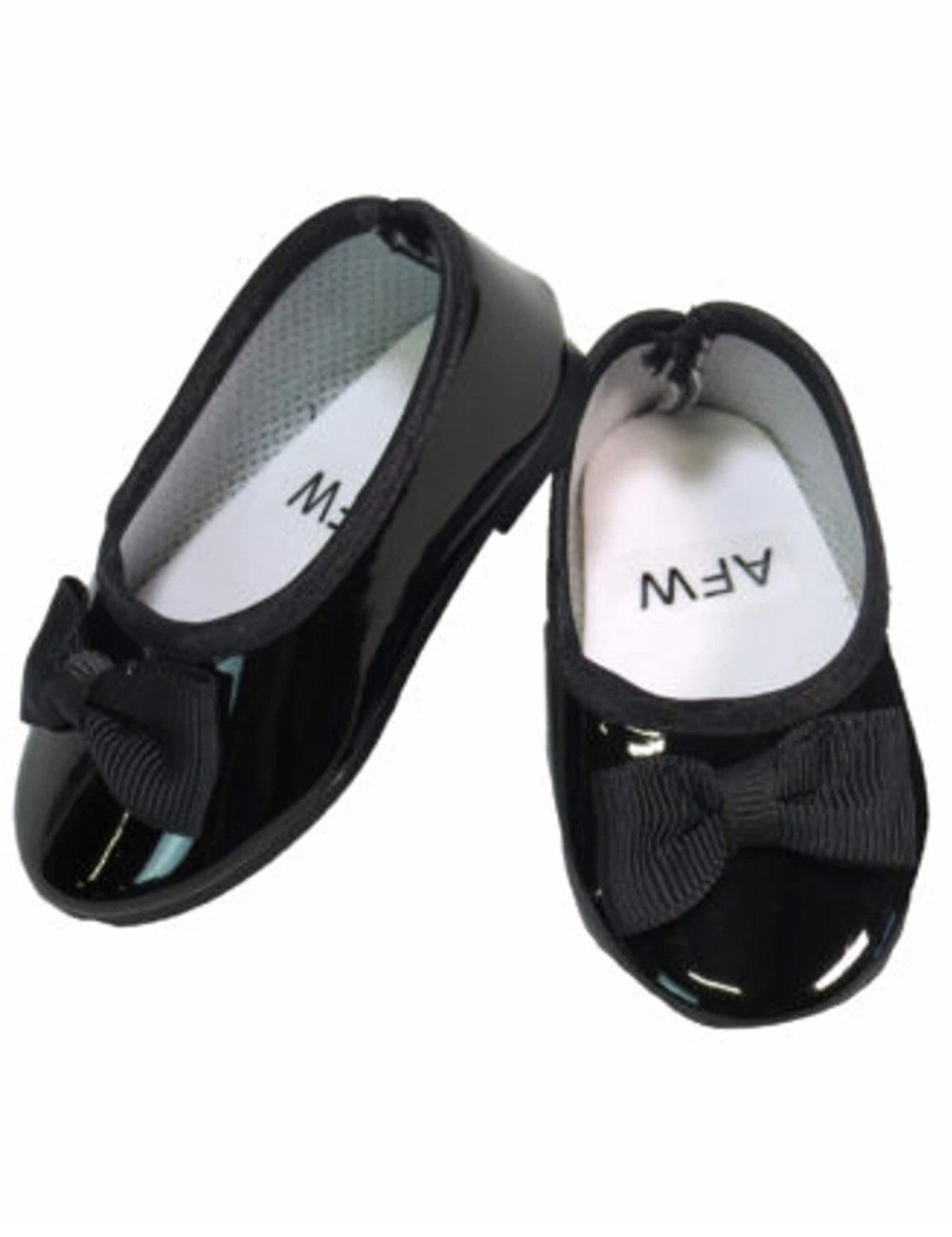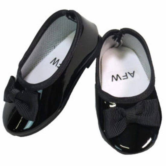 Black Patent Leather Flats w/ Bows Let your doll step out in style with these sleek black patent leather flats adorned with charming bows. The glossy finish adds instant polish to any outfit, while the bow detail brings a touch of elegance and fun. Perfectly sized for 18-inch American Girl dolls, these versatile flats work for everything from casual playdates to fancy dress-up adventures.