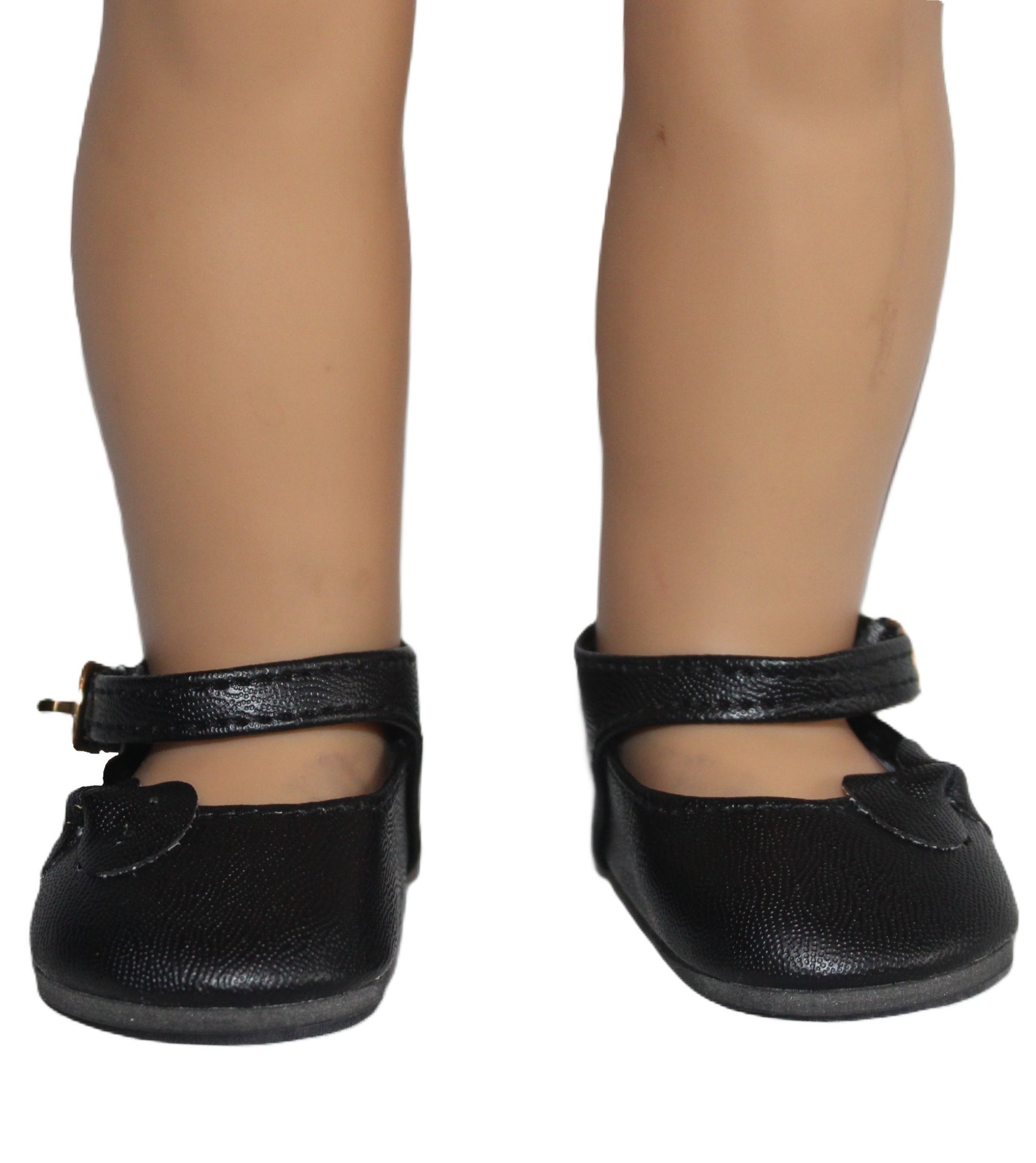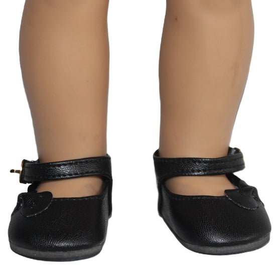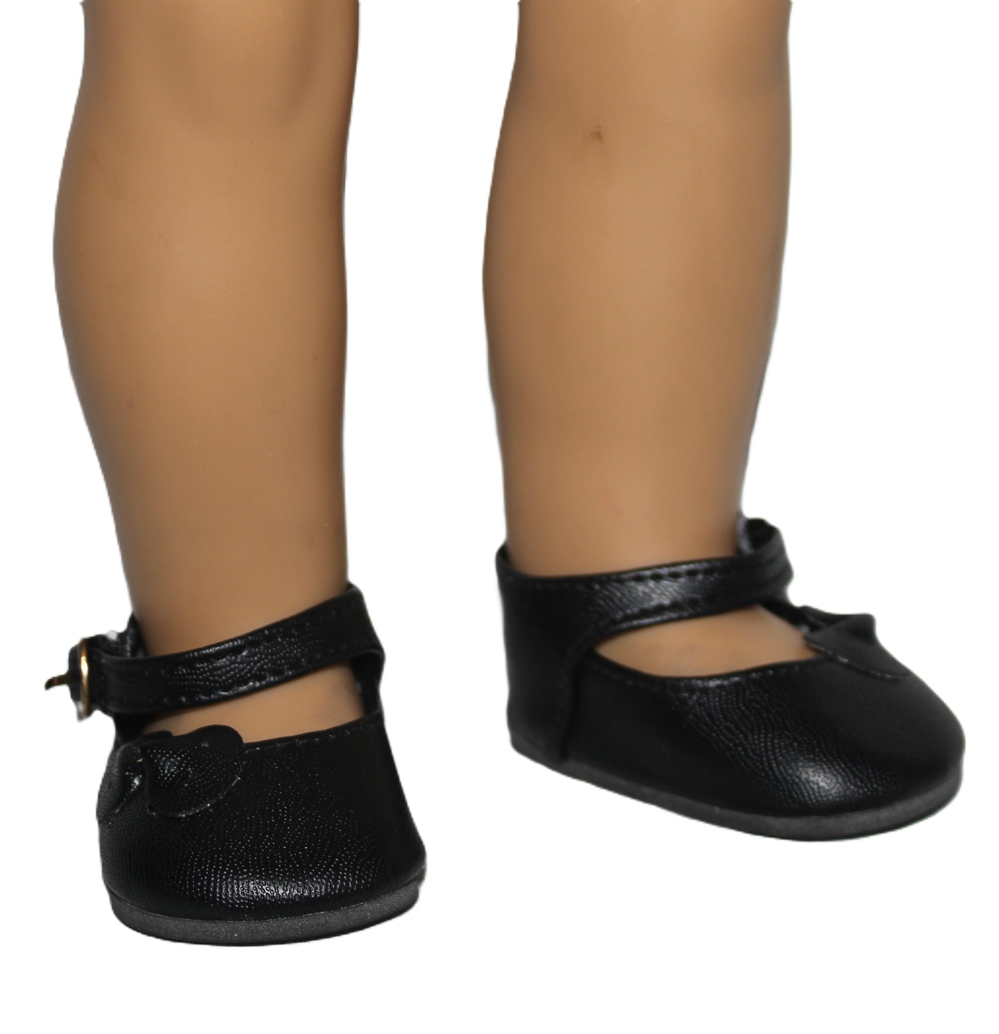 Black faux leather Mary Jane dress shoes with side bow close with buckles.