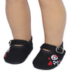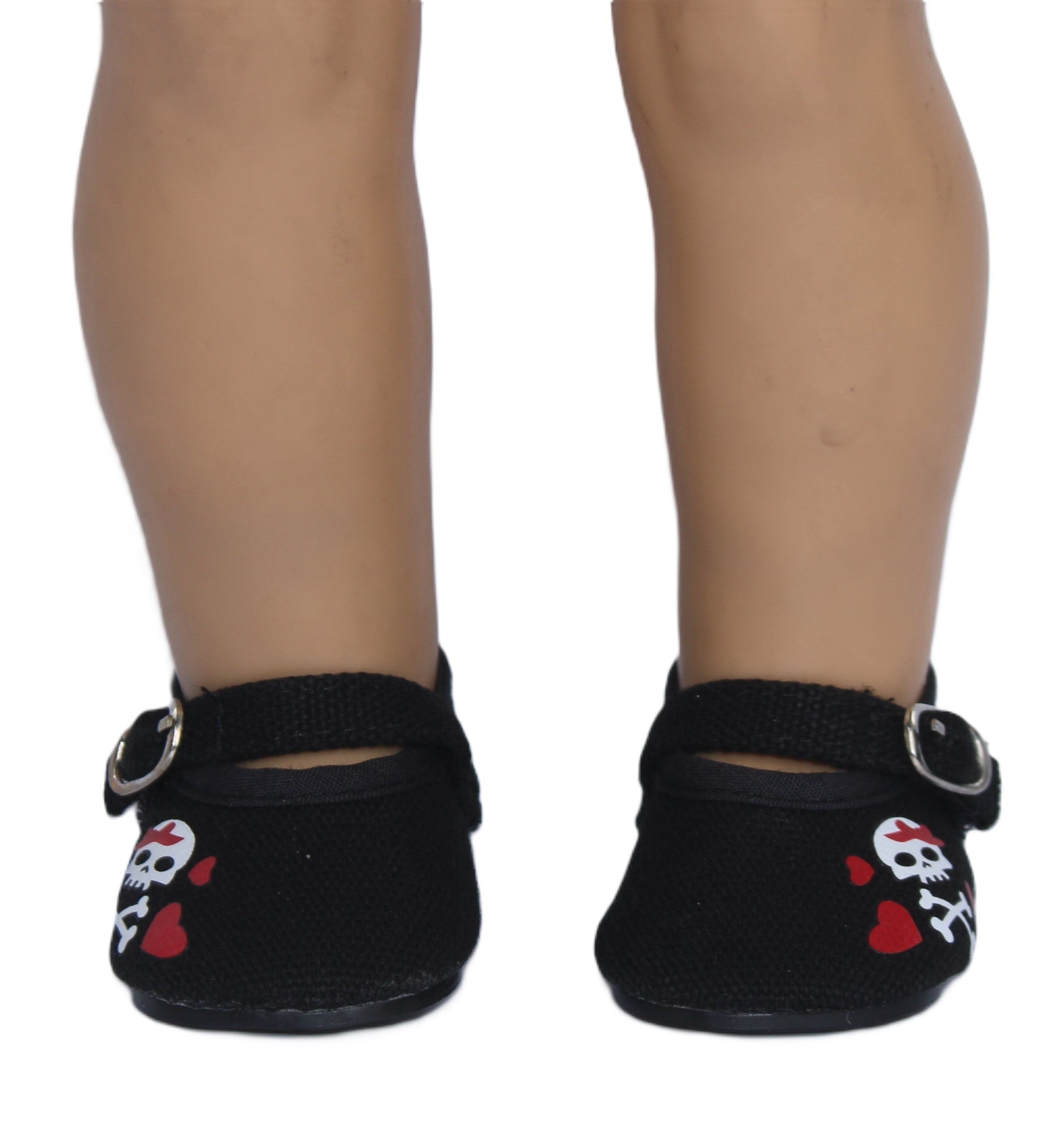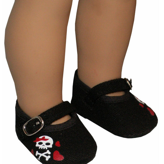 Black canvas Mary Jane dress shoes with skulls and hearts.