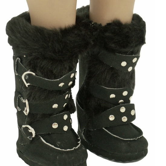 These black faux suede boots are the perfect edgy addition to your American Girl doll’s wardrobe. With cozy fur lining, shiny studs, and cool buckles, they add a fun twist to any outfit. Easy to put on and take off thanks to the zipper closure, these boots bring style and attitude to every doll adventure.