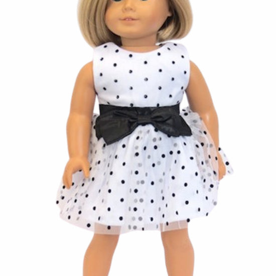 This classic black and white polka dot dress is a timeless treasure for your American Girl doll! The cheerful polka dot pattern pairs beautifully with a charming black bow accent at the waist, adding an extra touch of elegance. Perfect for dressing up your doll for special occasions or everyday adventures, this versatile frock brings retro-inspired style to playtime. A delightful wardrobe essential!