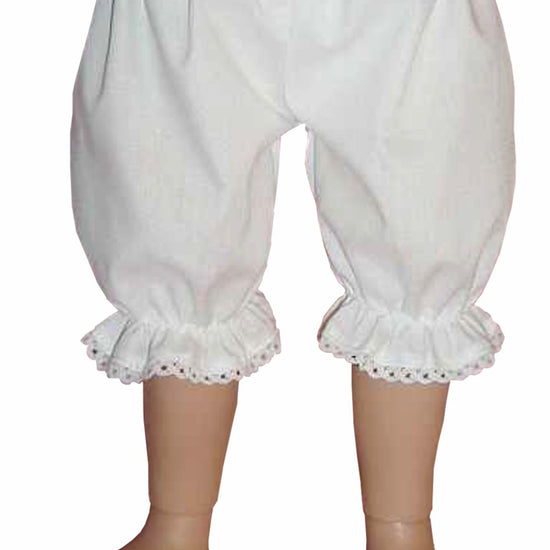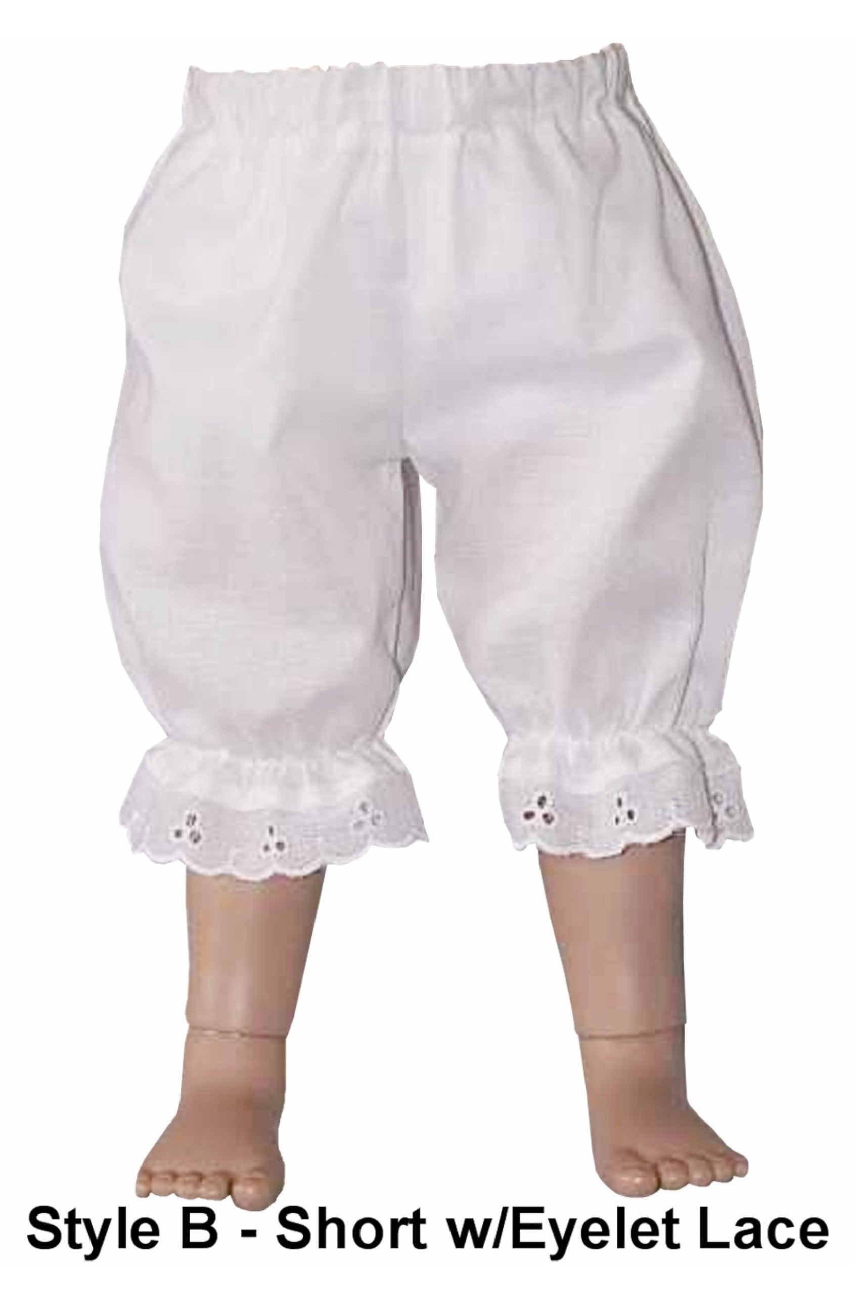 These playful Bloomers for My Twinn dolls come in long (A) or short (B) styles, both featuring a comfy elastic waist. Choose from many colors or prints. You can also add a charming touch with white edging or eyelet lace at the hem—available only in classic white.