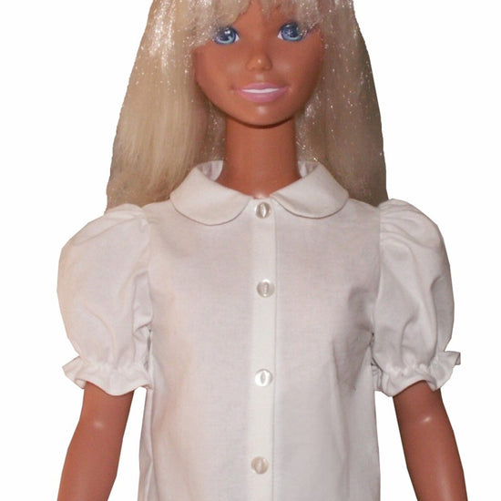 Dress your 36" My Size Barbie doll in timeless style with this charming blouse! Featuring a classic Peter Pan collar and your choice of short or long gathered sleeves, this piece captures vintage-inspired elegance. Decorative buttons add a sweet finishing touch, while a secure Velcro closure makes dressing easy. Perfect for creating multiple looks in your doll's wardrobe.
