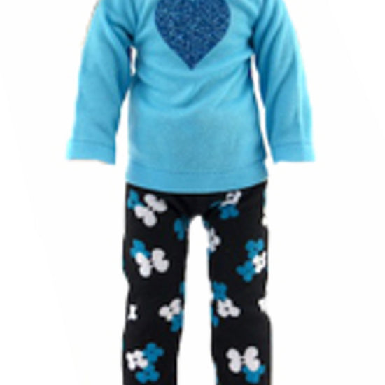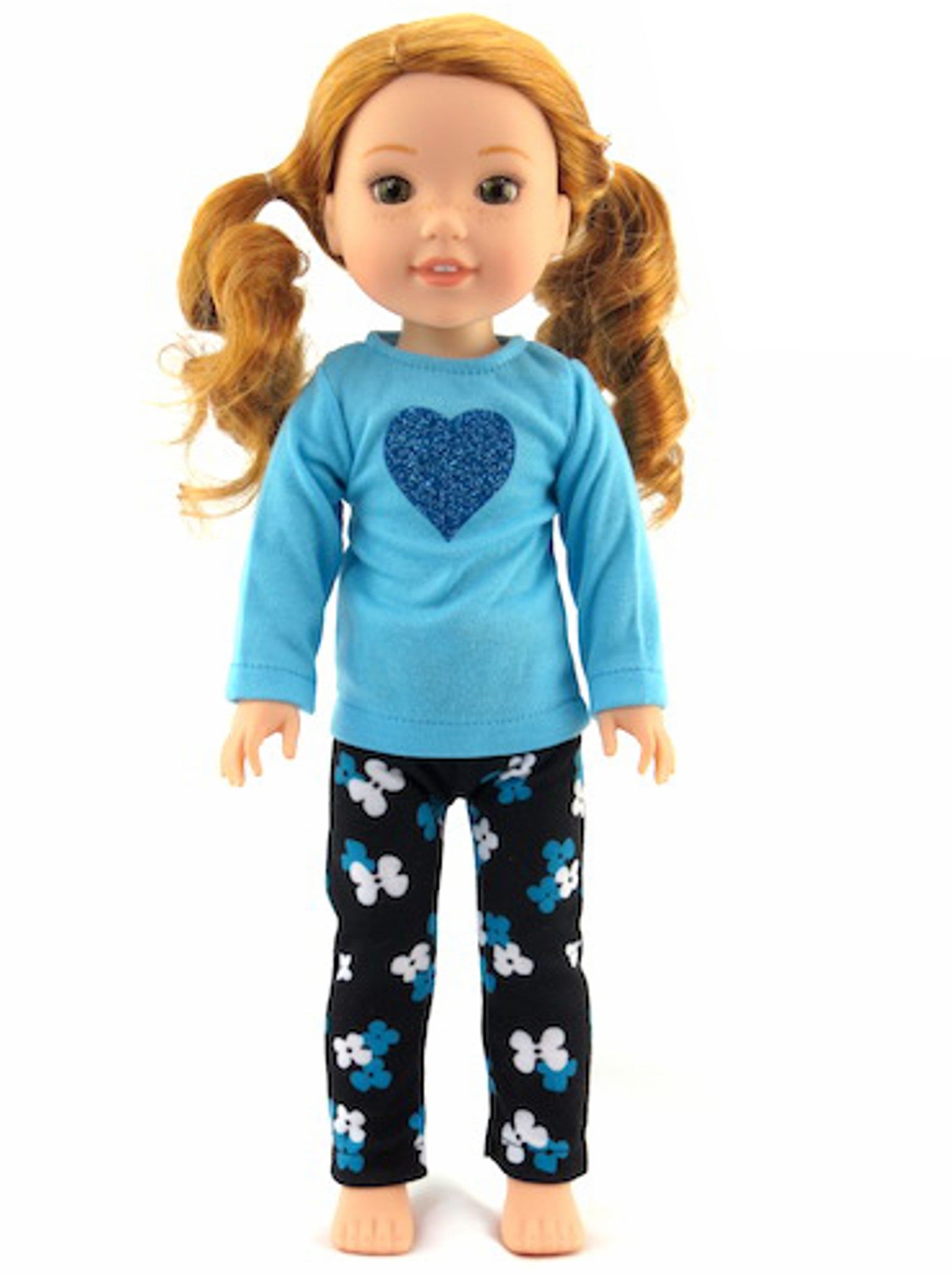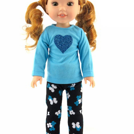 This blue heart pant set for WellieWishers dolls includes a matching shirt and printed leggings. The coordinated outfit offers a cute and comfortable look, perfect for everyday doll adventures.
