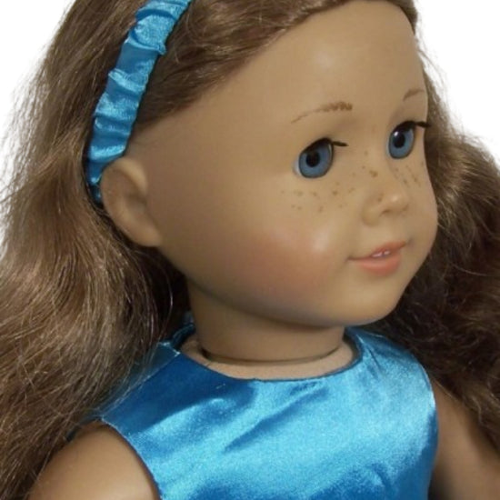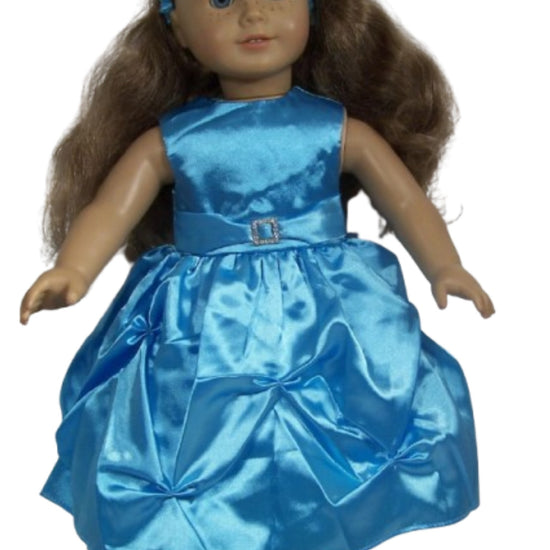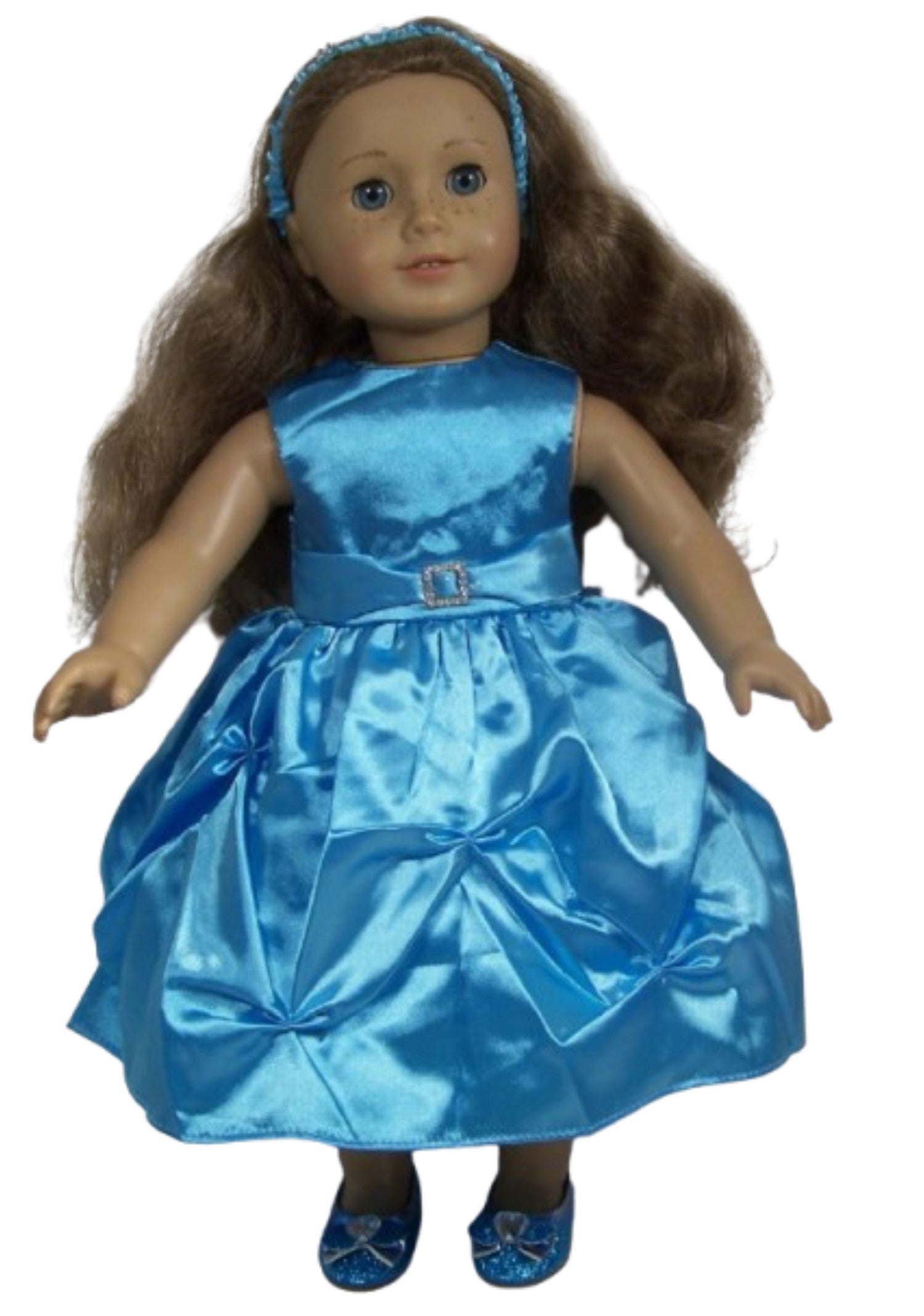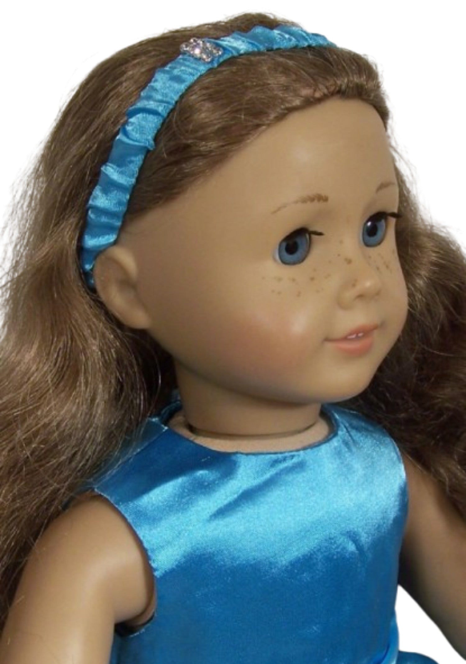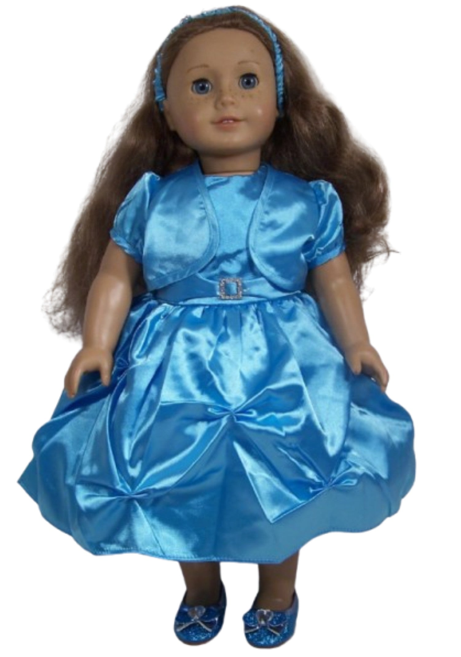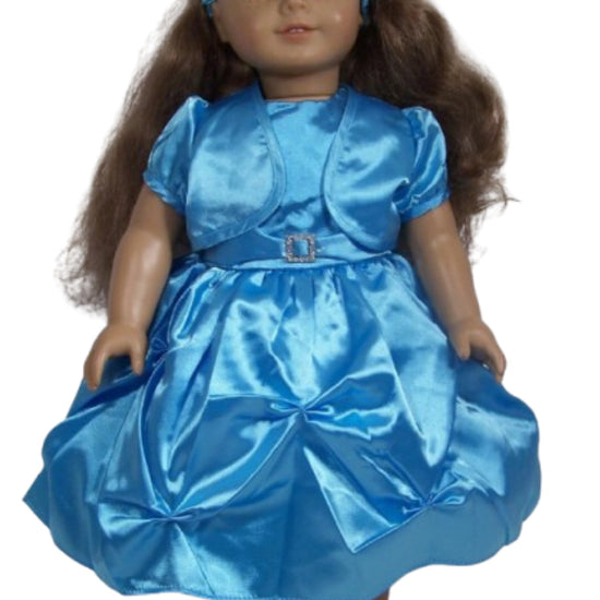 Blue sleeveless dress with jacket includes a matching headband with rhinestone accents.