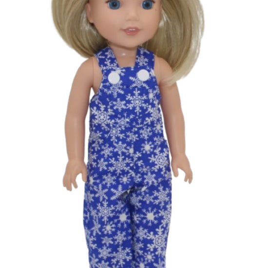 Blue Snowflake Overalls for 14.5" WellieWishers dolls bring winter charm and practical style to playtime! These adorable overalls feature a festive snowflake pattern, functional front pocket for tiny treasures, and decorative top-stitching that shows off handmade quality. Secure metal snaps make dressing your doll quick and easy, so she's ready for any snowy adventure. Perfect for building a versatile doll wardrobe!
