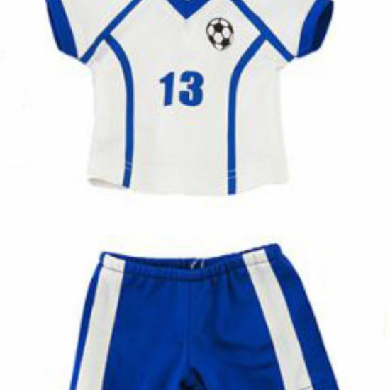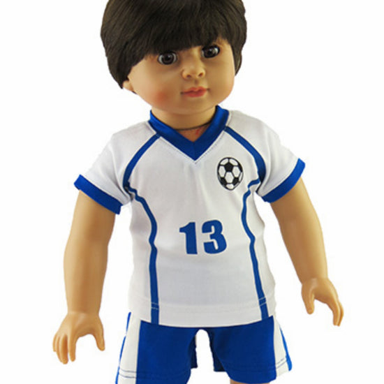 Get ready for match day with this dynamic soccer outfit for your 18" American Girl doll! A classic white jersey showcases striking blue trim, paired with coordinating shorts for a polished athletic look. Perfect for doll athletes who love the beautiful game, this set captures the excitement of soccer season. Thoughtfully designed and expertly crafted, the pieces fit your doll like a dream. Whether she's training hard or celebrating a victory, this spirited ensemble keeps playtime fun and fashionable!