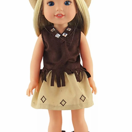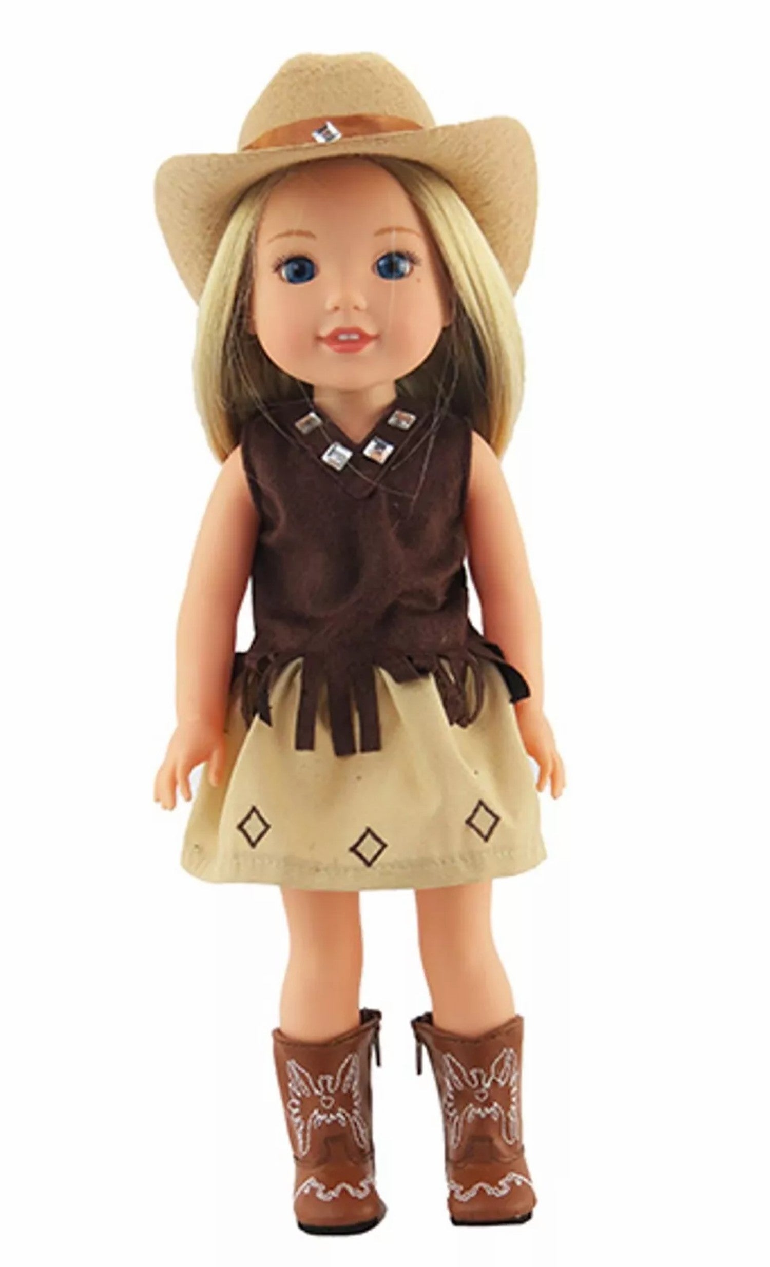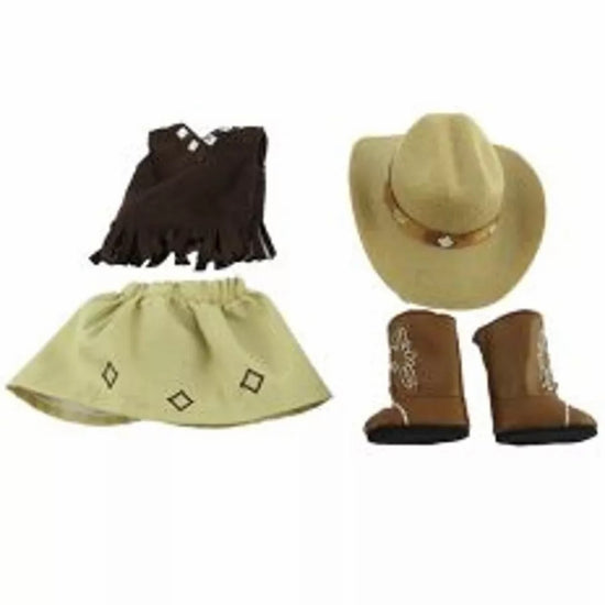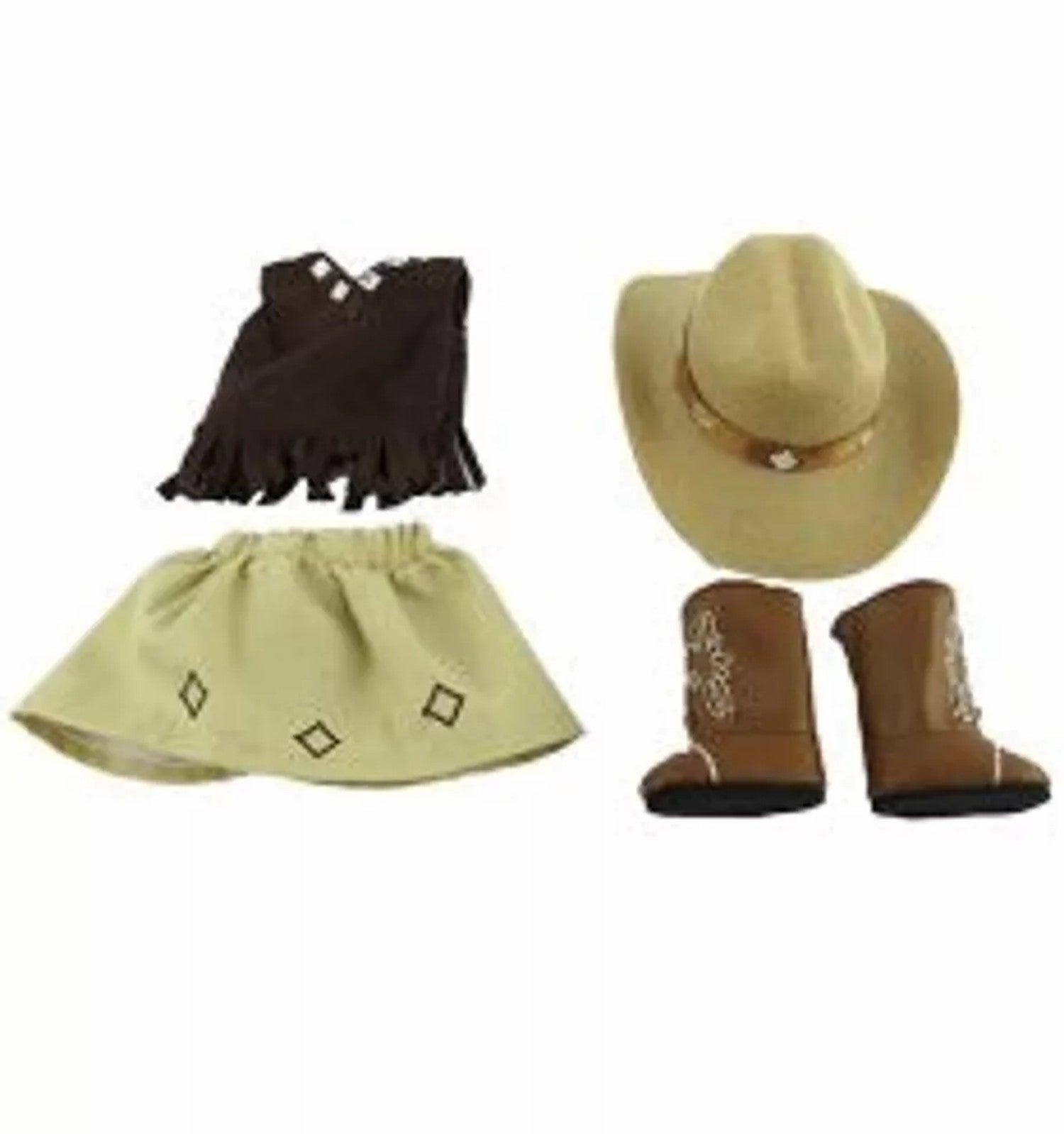 4 pc western outfit includes brown top, skirt, cowboy hat and faux suede boots.