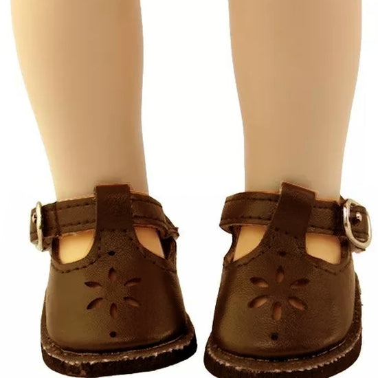 Give your doll a stylish twist with these brown Mary Janes for WellieWishers. The charming flower-shaped cut-outs add a playful flair, making them perfect for dress-up fun and adventures. Sleek and cute, these shoes complete any outfit with a touch of whimsy.