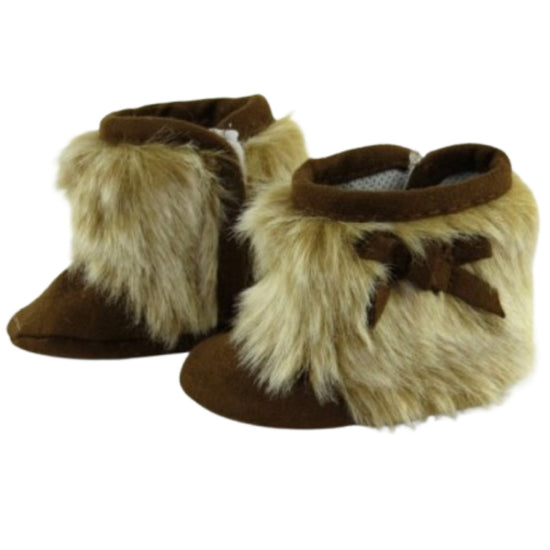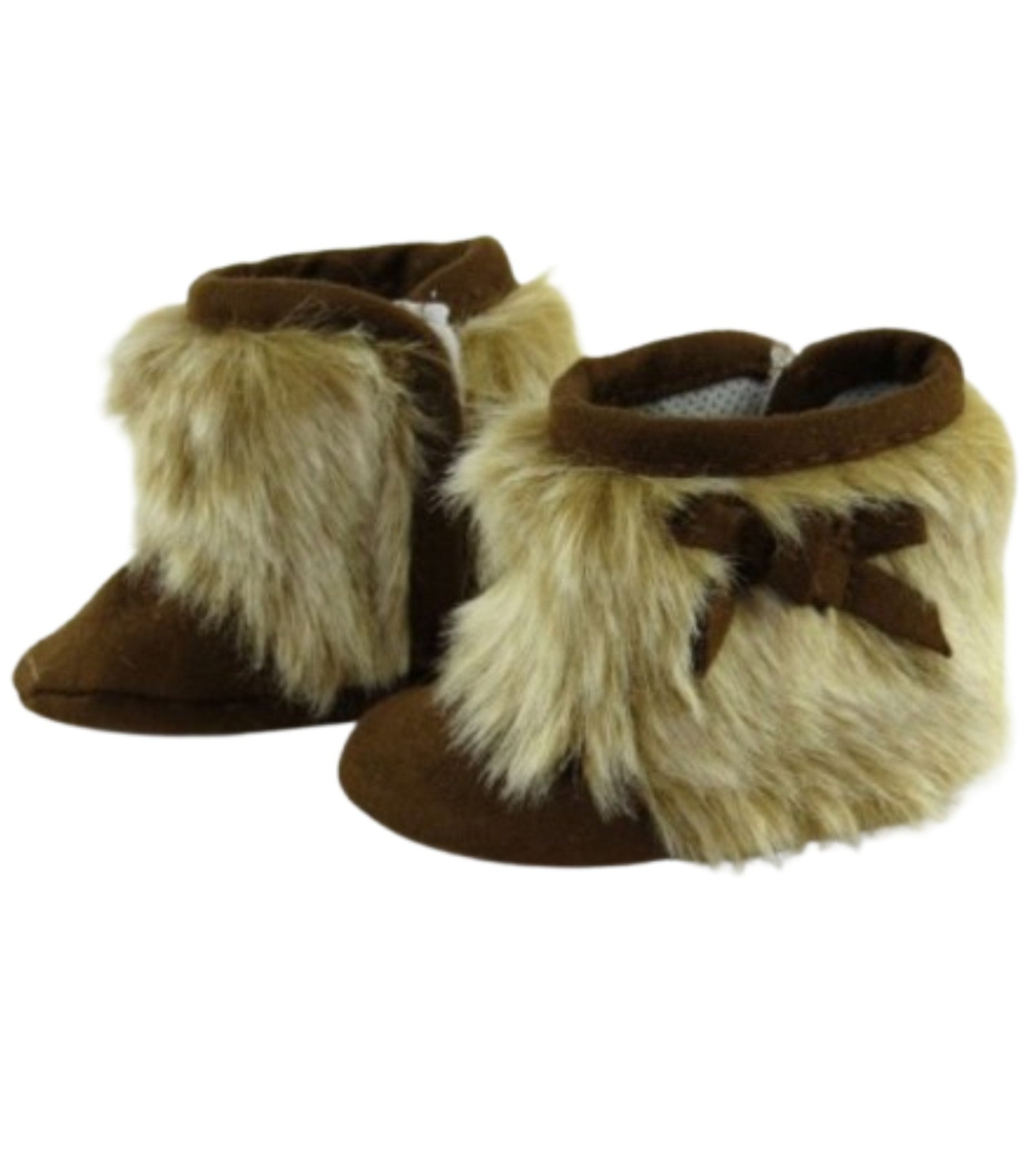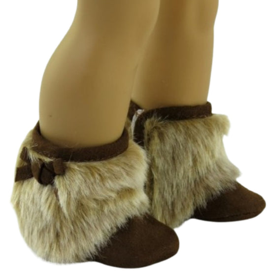 Step into luxury with these charming tan fur boots featuring rich brown suede accents! Rising to the lower calf with adorable suede bows on the sides, they fasten with convenient velcro closures. Crafted to fit 18" American Girl dolls perfectly, these boots deliver cozy elegance for any season!
