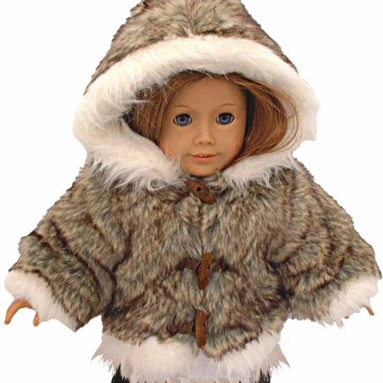 Luxurious brown faux fur winter parka with hood. Coat closes with toggle buttons.