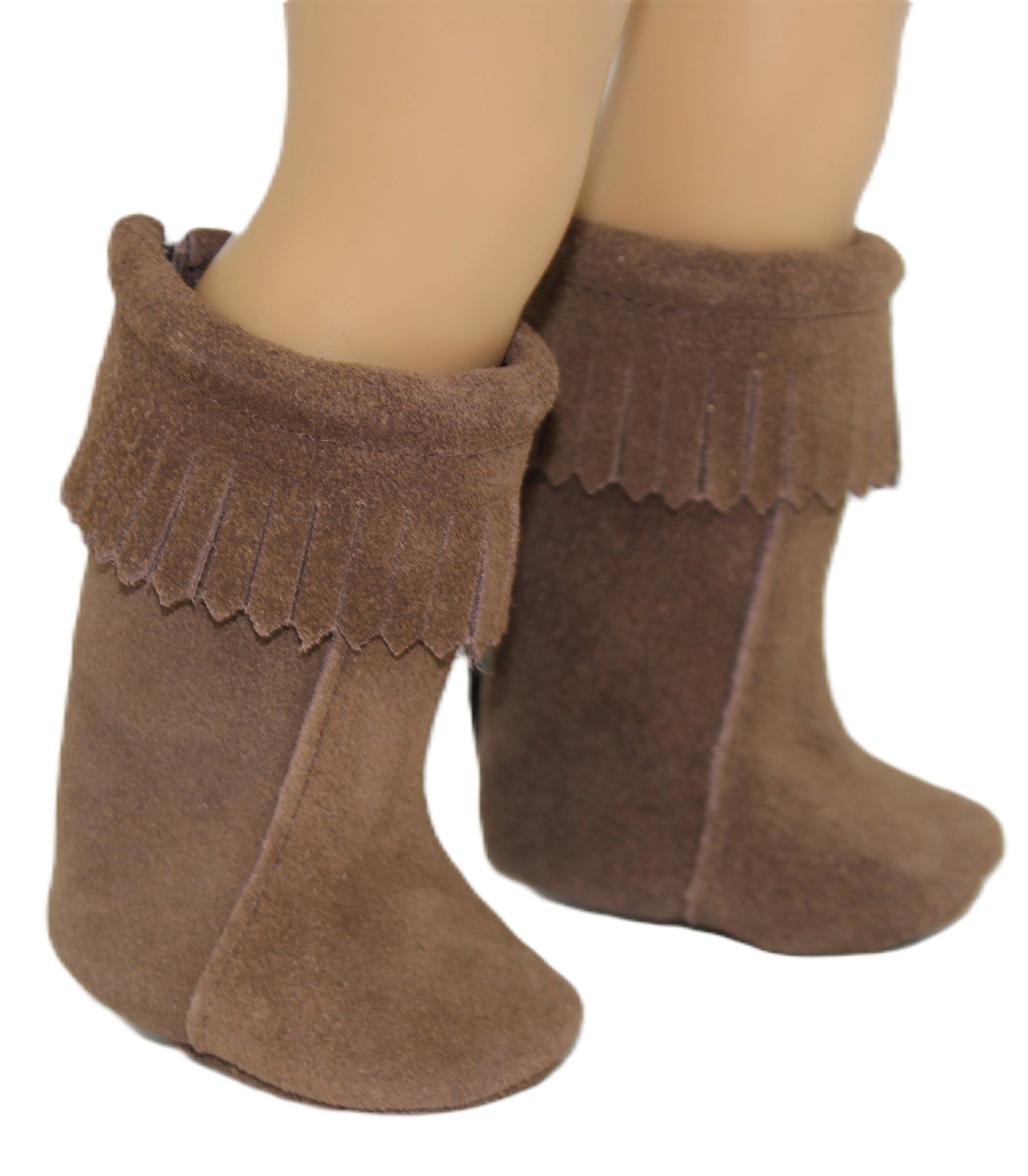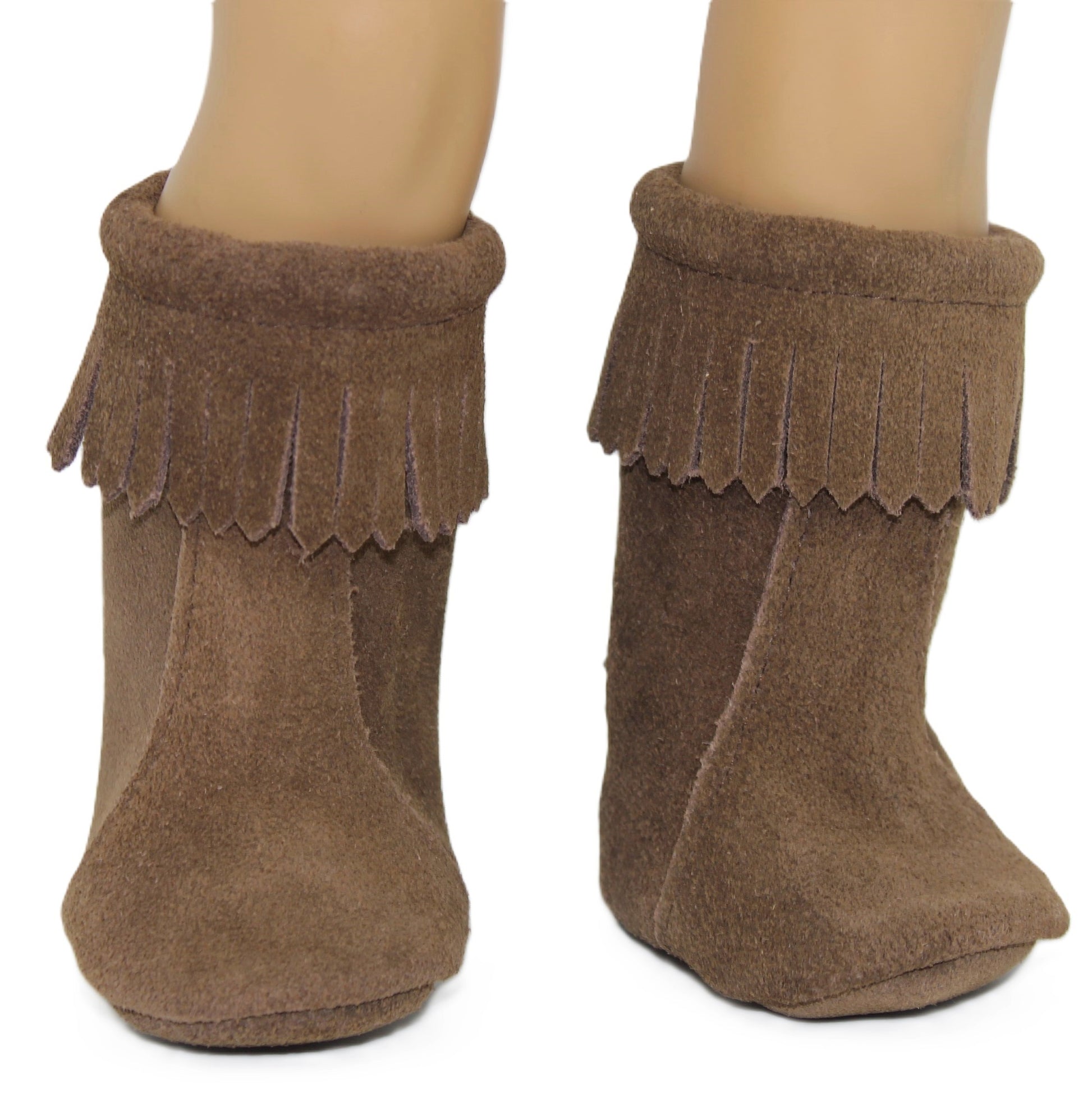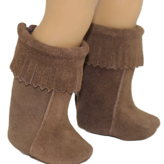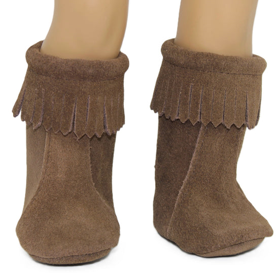 Tall brown faux suede moccasin boots have heavy faux suede soles and close with Velcro.