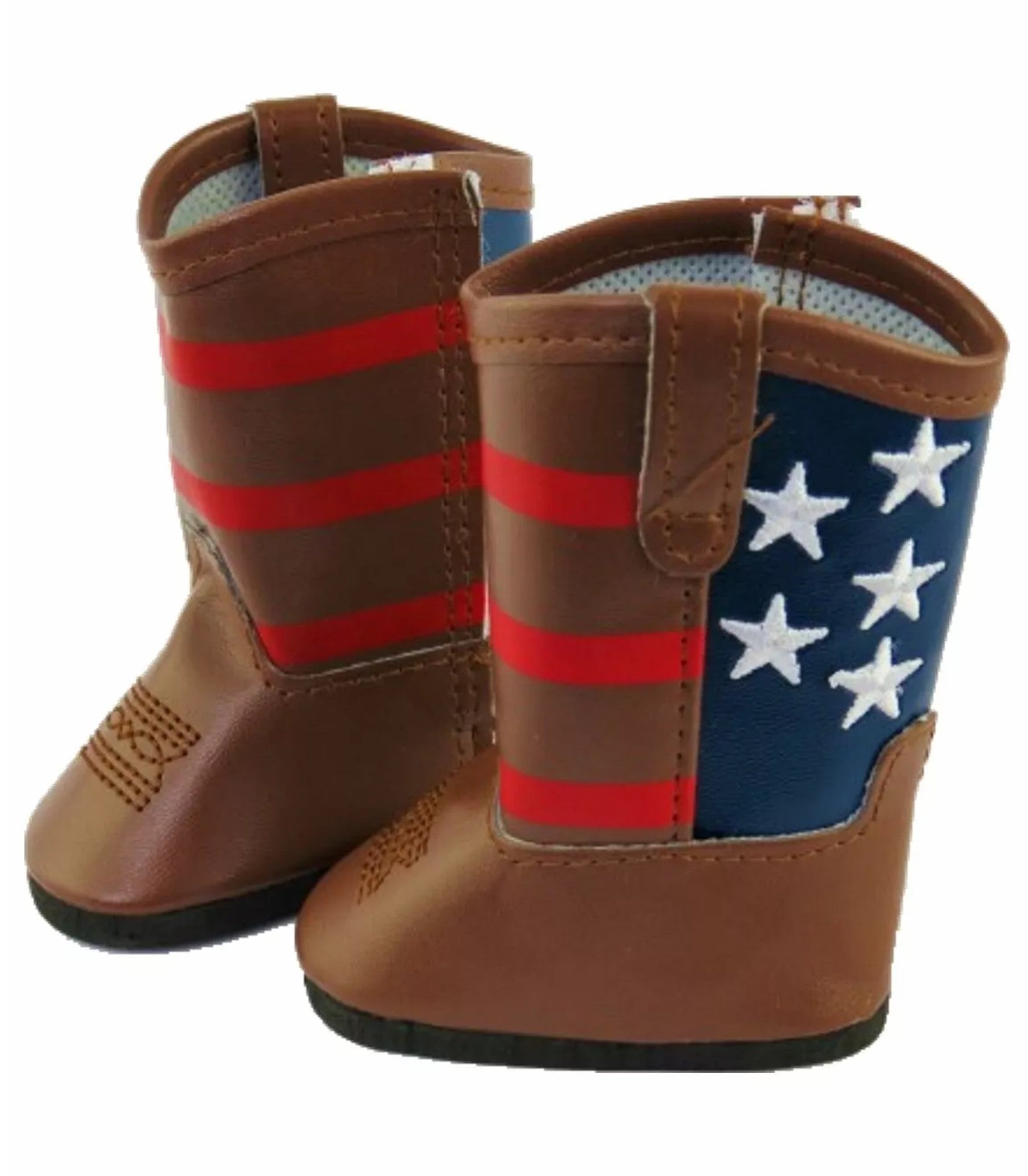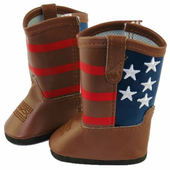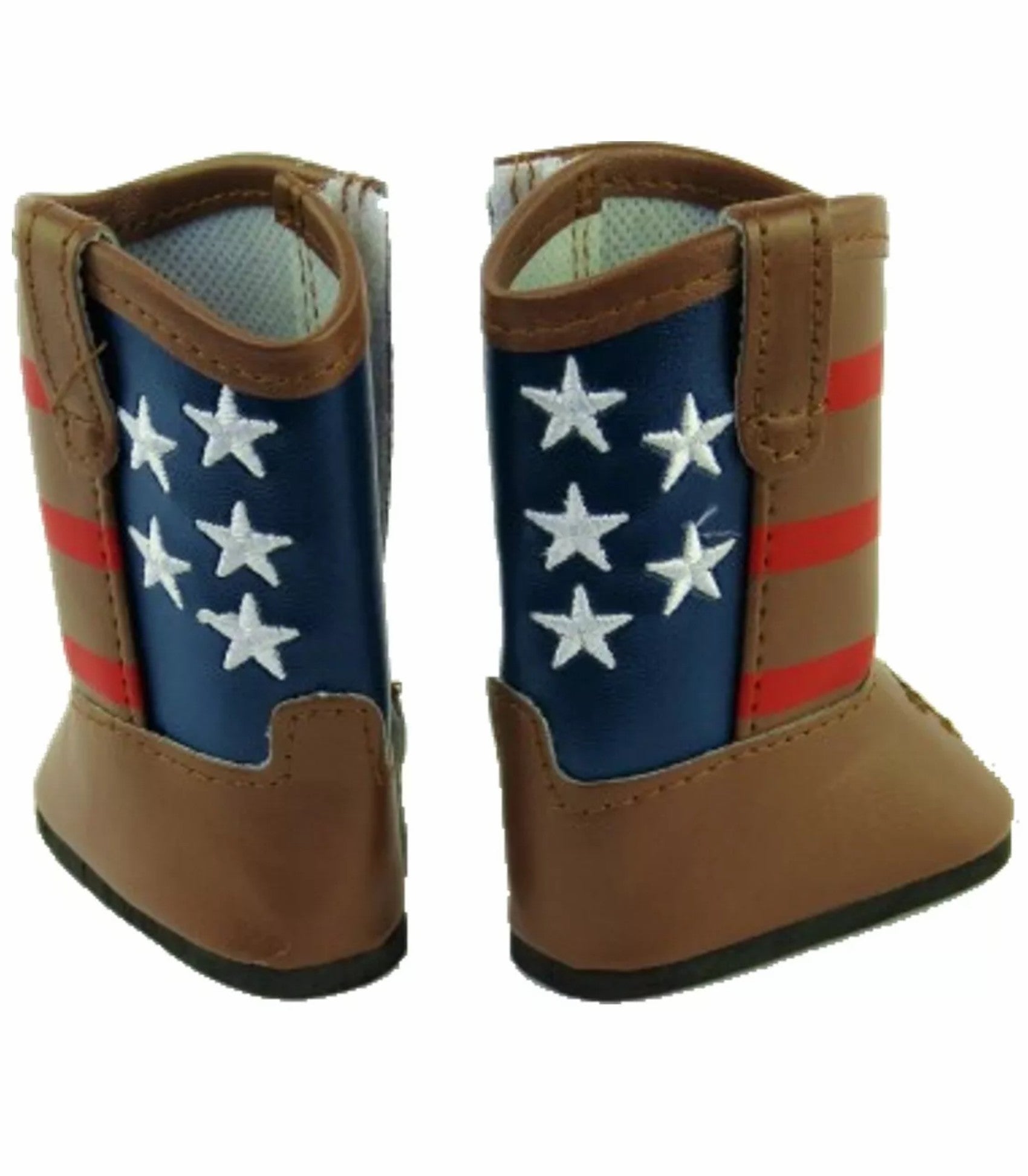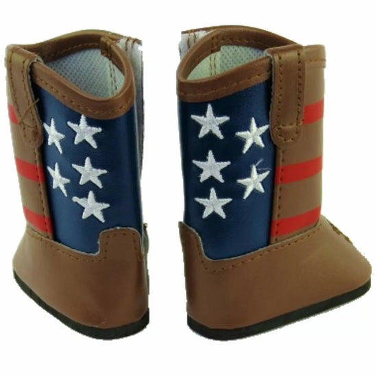 These brown mid calf length boots have a Velcro closure on the side. The back of the boots to the ankles are navy blue and feature 5 white stars, while red stripes cover the front of the boot to the ankle as well.