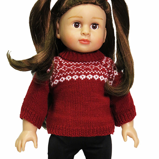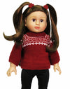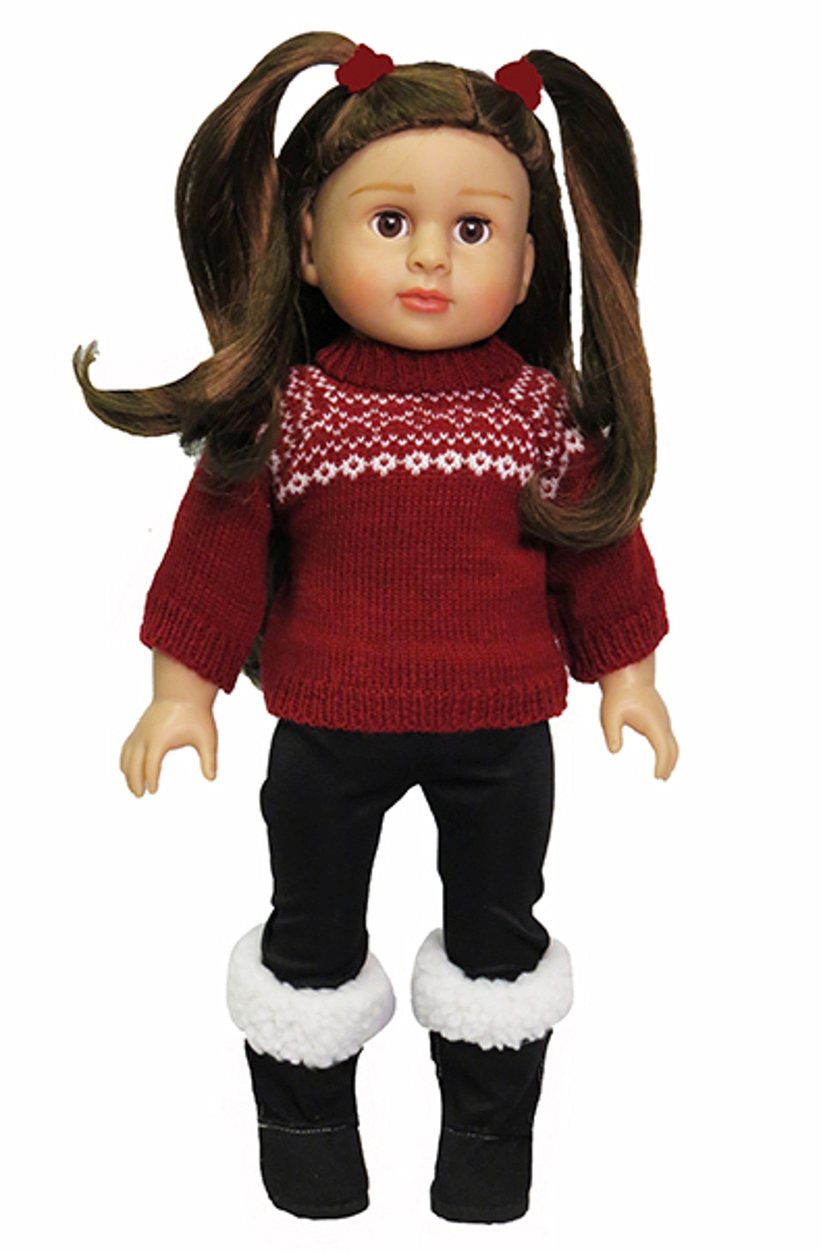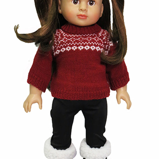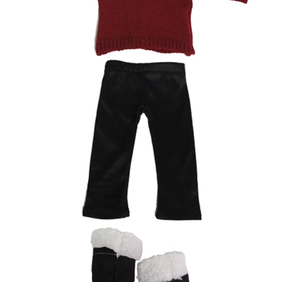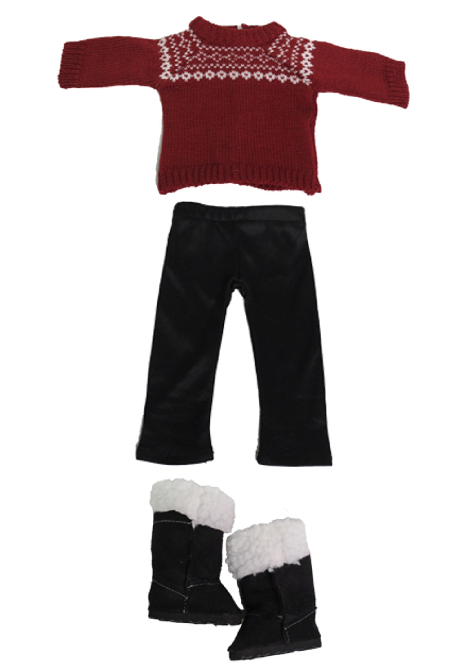Burgundy and white sweater set includes sweater, black leggings and black boots with fleece trim.
