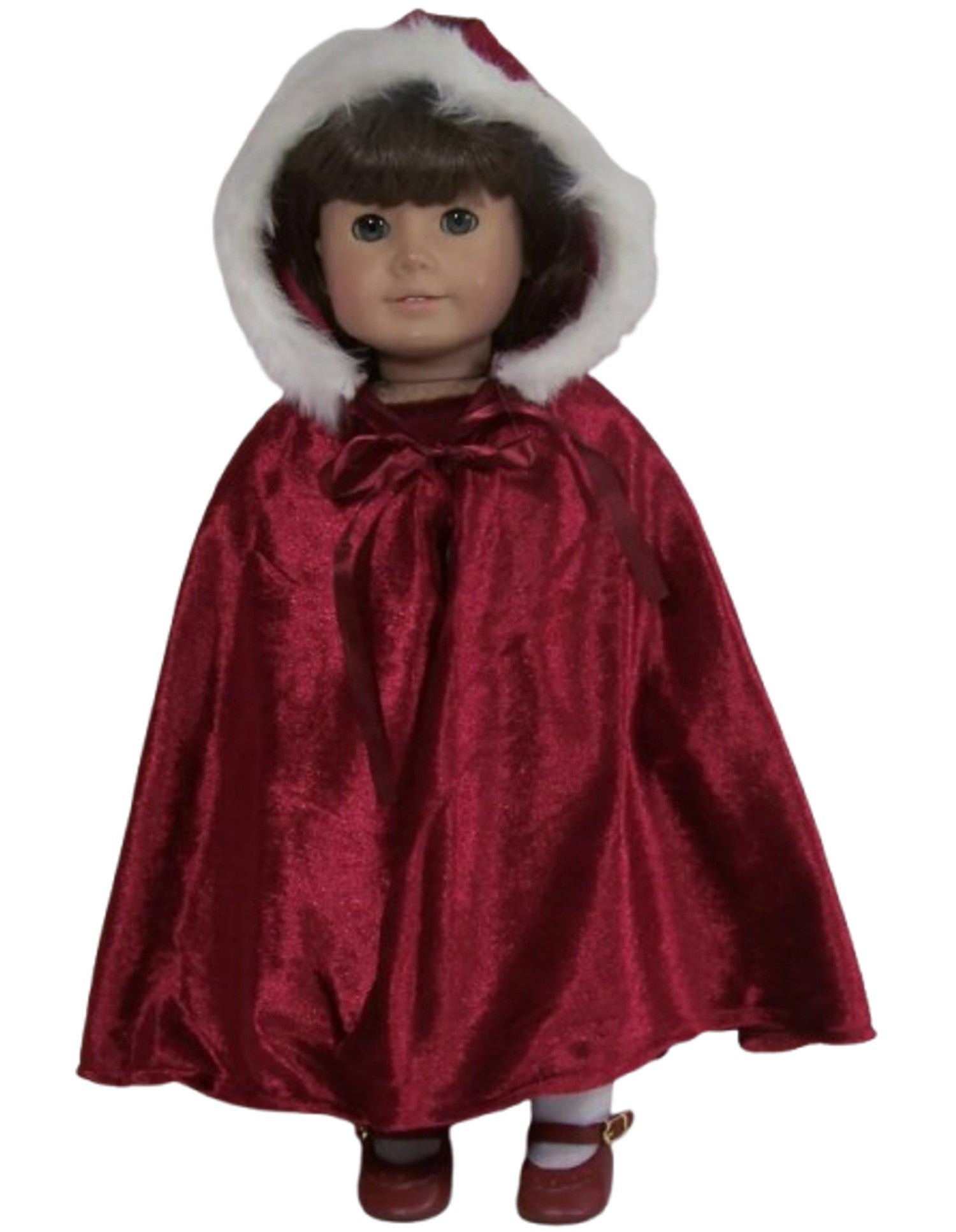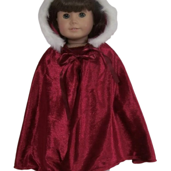 Wrap your American Girl doll in luxury with this stunning burgundy velour cape! The rich, deep color pairs beautifully with the plush white fur trim framing the hood, creating an elegant look that's perfect for royal adventures, fancy occasions, or just feeling fabulous. Soft velour fabric drapes gracefully, making this cape an instant wardrobe favorite that transforms any outfit into something special.