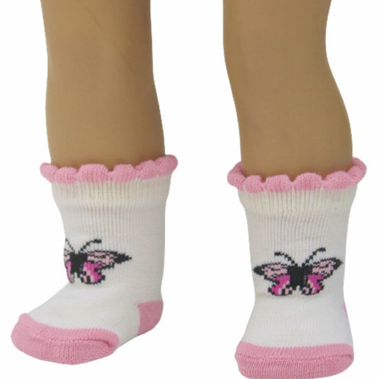 Flutter into fun with these delightful white and pink butterfly socks! Designed with versatility in mind, these cozy socks fit most dolls with average-size feet, from Bitty Baby dolls to full-size 18-inch American Girl dolls and most dolls between 15-22". The cheerful butterfly print adds a whimsical touch to any doll outfit, whether for everyday play or special occasions. Keep your doll's feet comfy and cute!