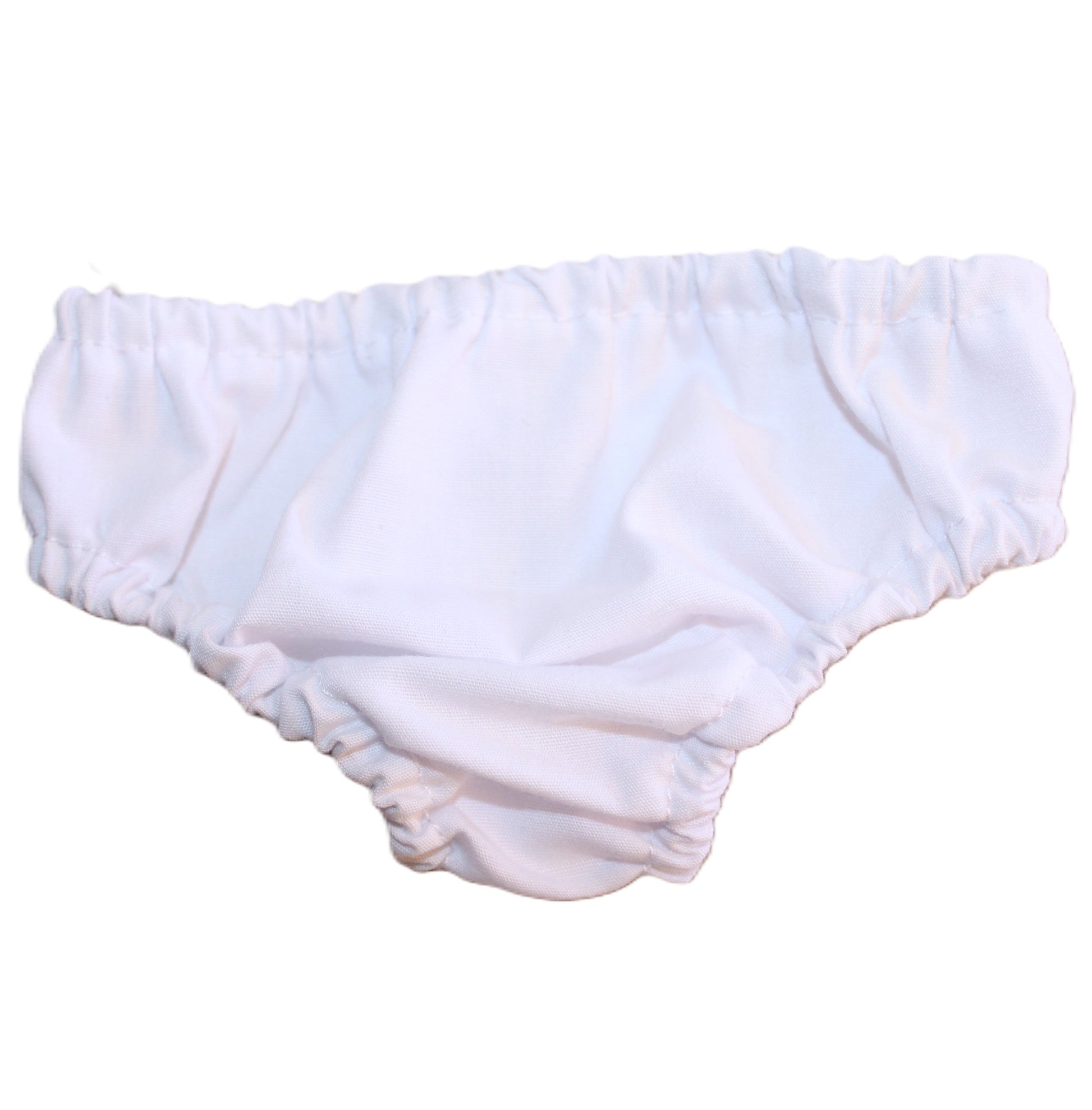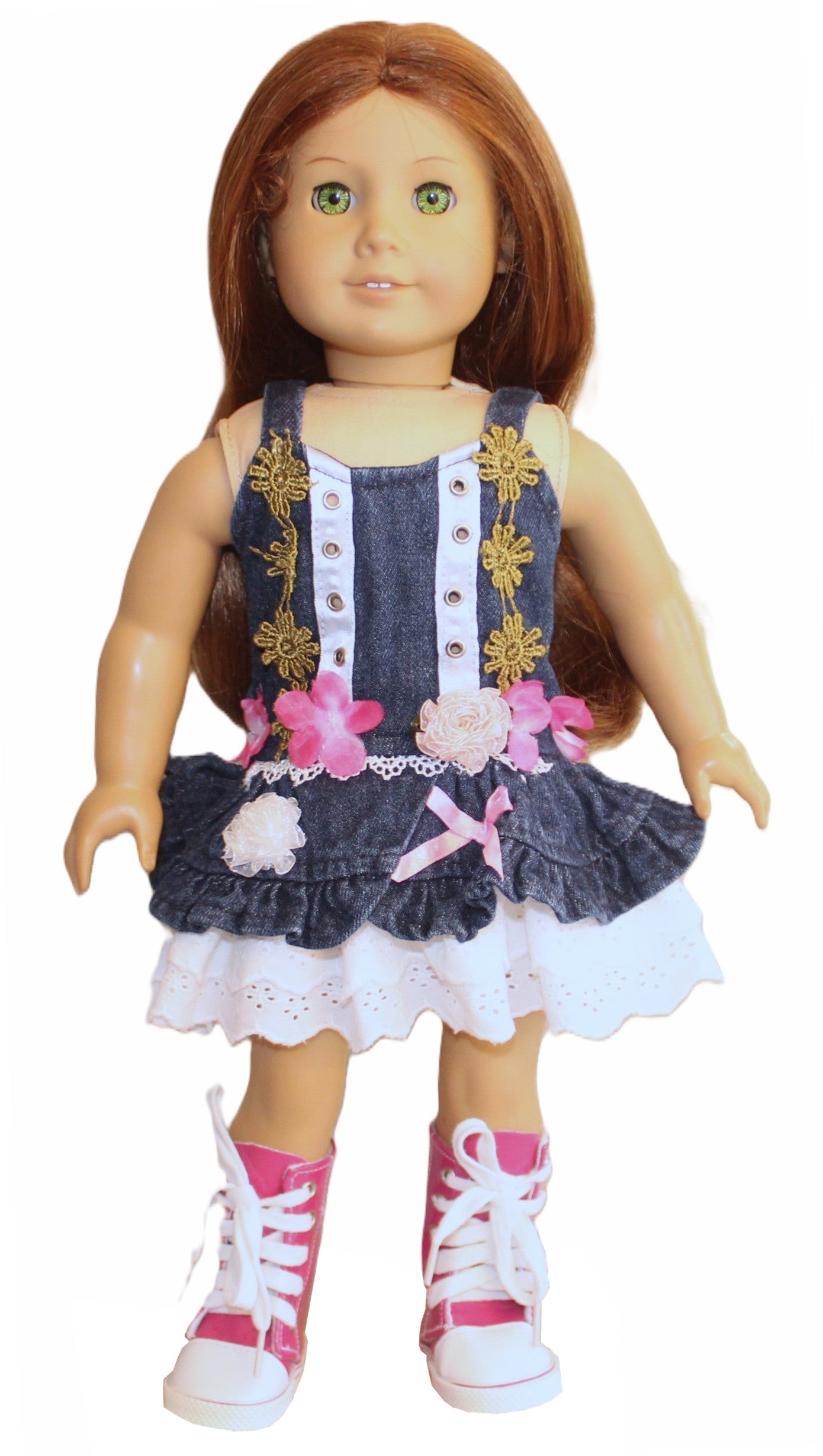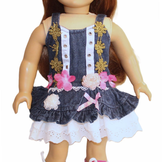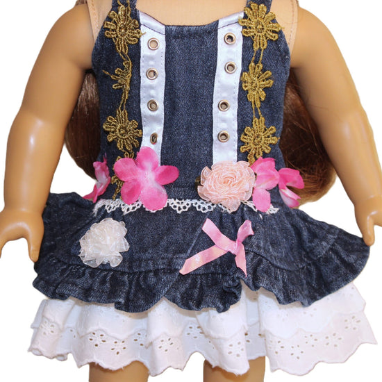 Denim and lace dress with flowers at waist with an attached lace underskirt and white panties.