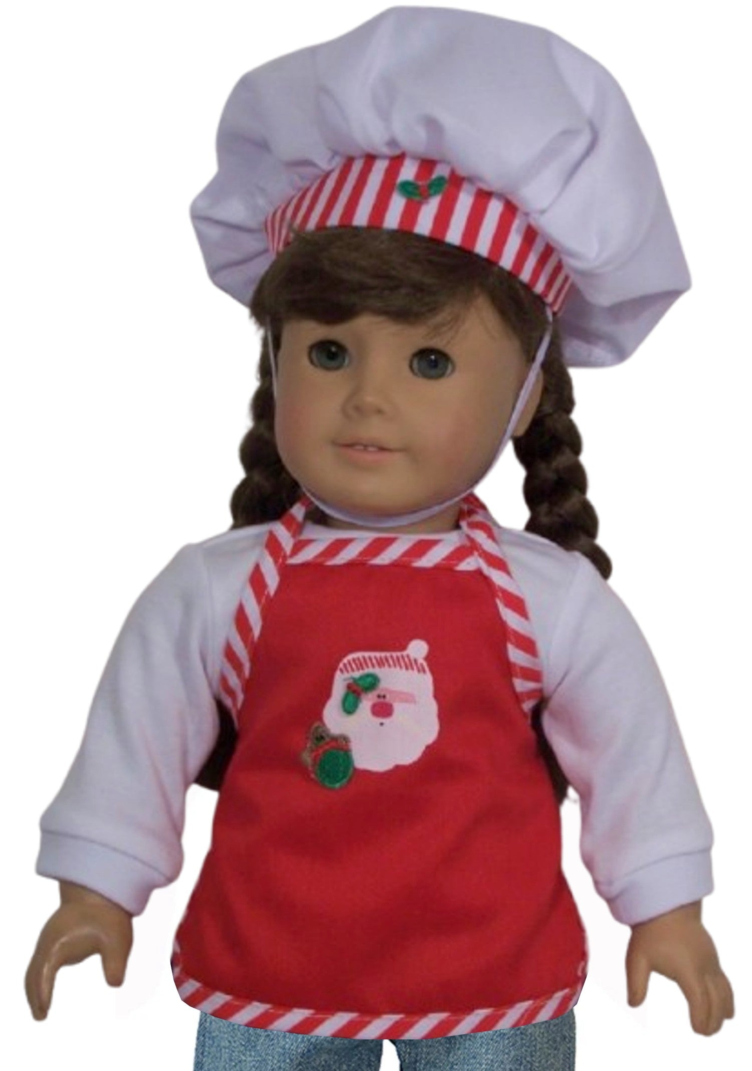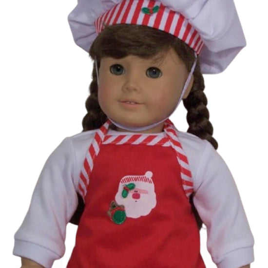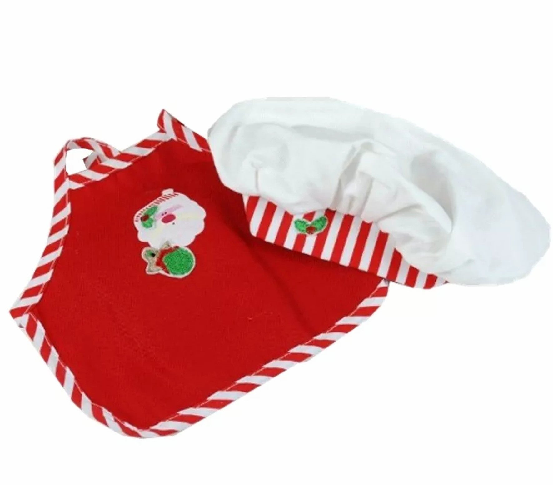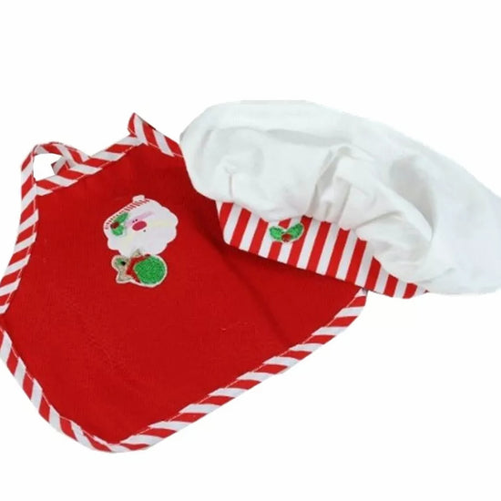 Red Christmas apron and matching chef's hat comes with a wooden spoon.