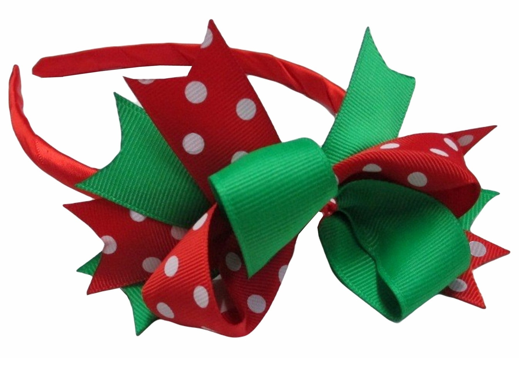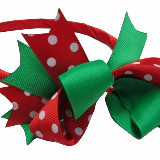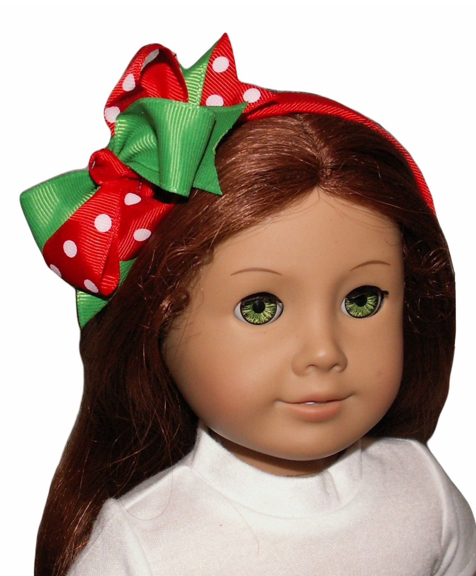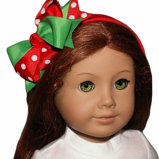Red and green ribbon headband is made to fit a doll with approx. 12" head circumference.