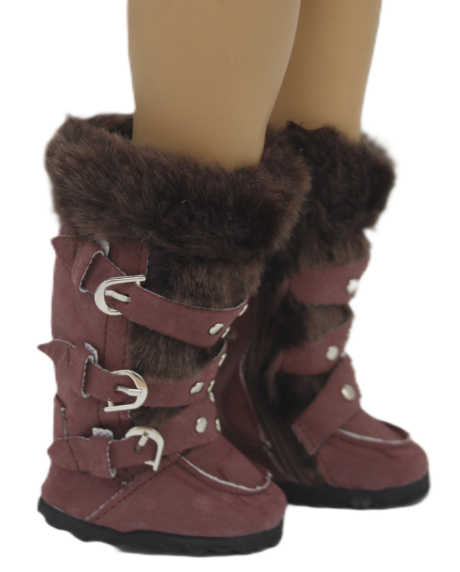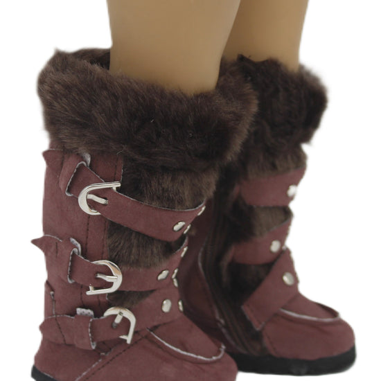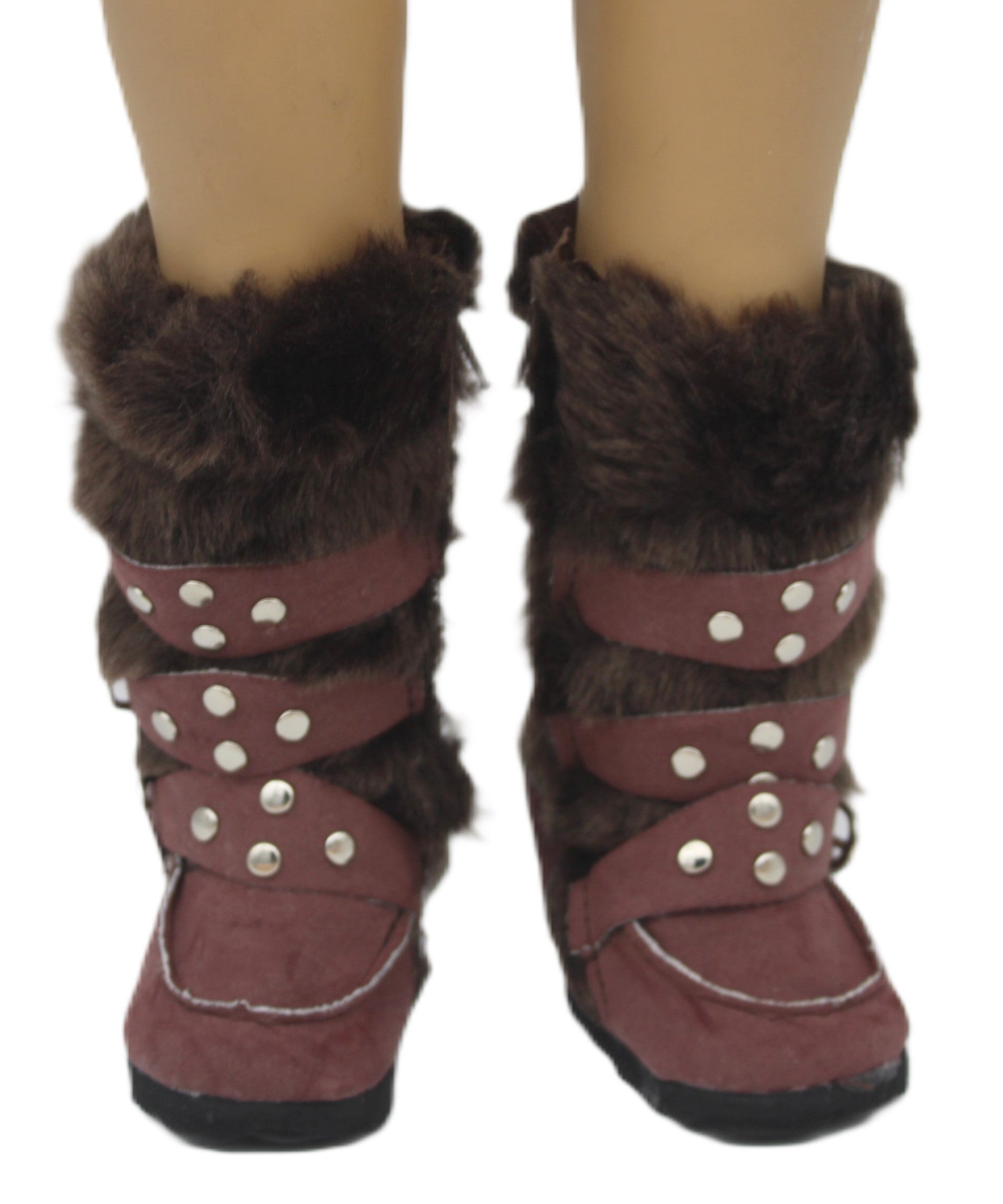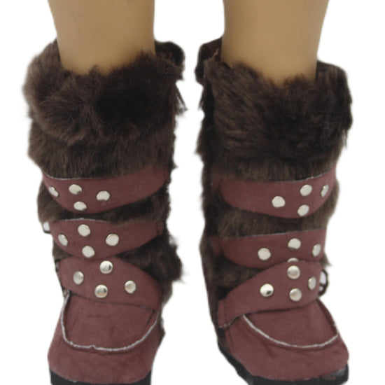 Dark brown faux suede leather boots with fur, studs and buckles.
