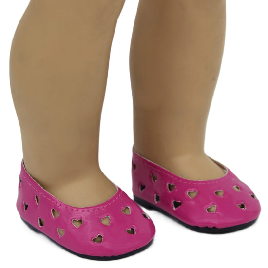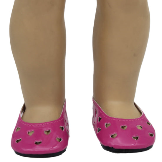 Love is in every step with these adorable dark pink heart cutout flats! These slip-on shoes feature charming heart-shaped openings that add a sweet, romantic touch to any outfit. Sized perfectly for 18-inch American Girl dolls, they're versatile enough to pair with dresses, pants, or skirts. The easy slip-on design makes dressing your doll a breeze, while the playful heart details bring instant personality and charm. Whether for Valentine's Day, special occasions, or everyday adventures, these flats are a delightful addition to any doll's footwear collection!
