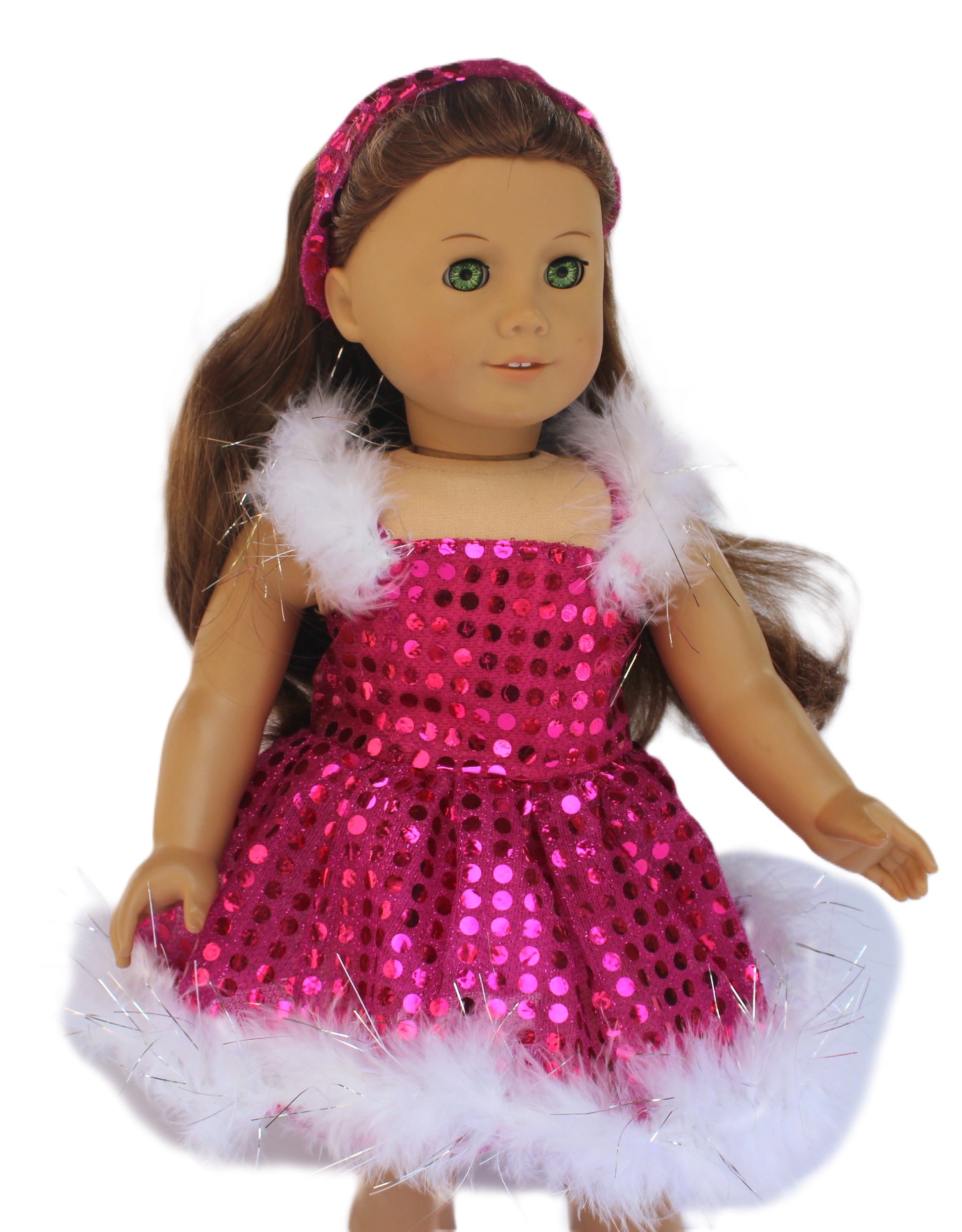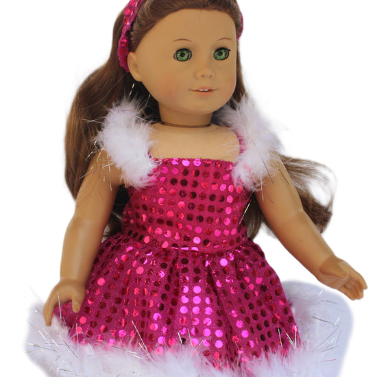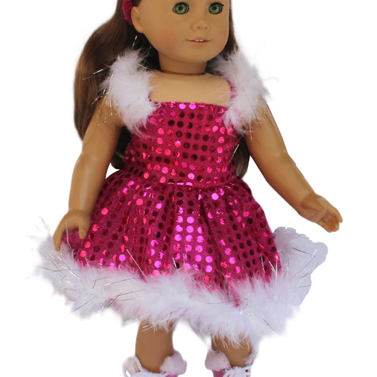 This sparkly dark pink skating dress dazzles with its shimmering fabric and playful white boa trim. Perfectly complemented by a matching headband and panties, it adds a touch of fun and flair to any doll’s dress-up collection. Let your doll glide into style with this charming outfit!