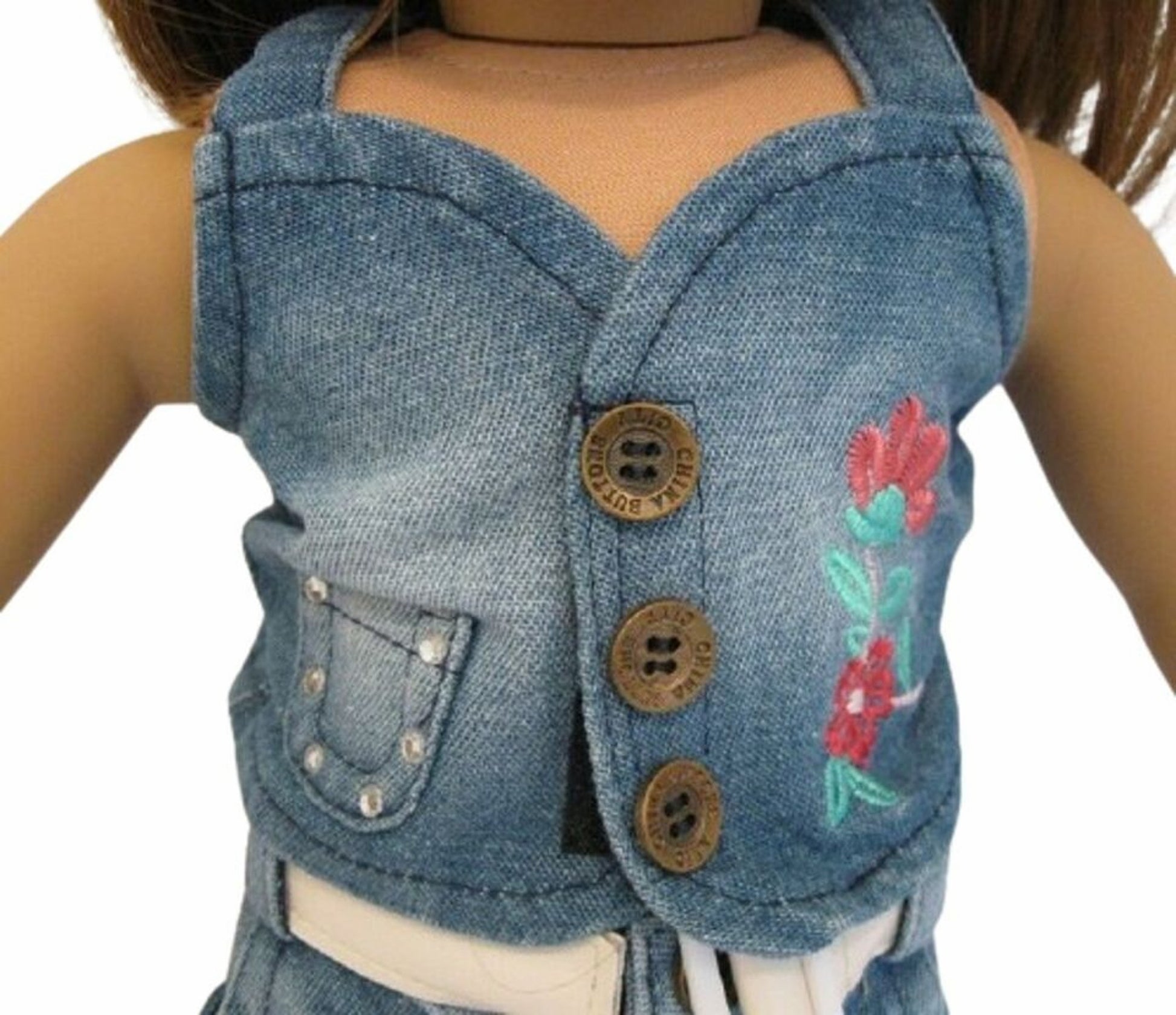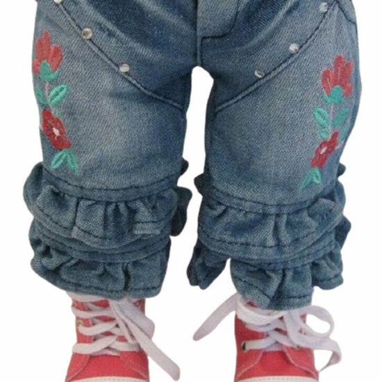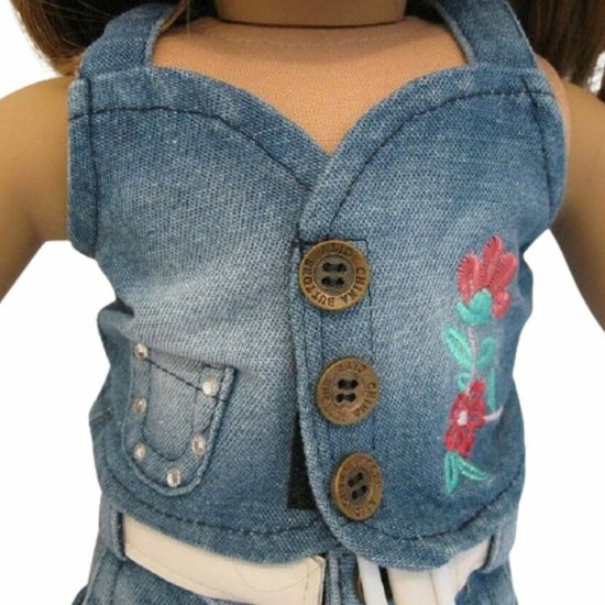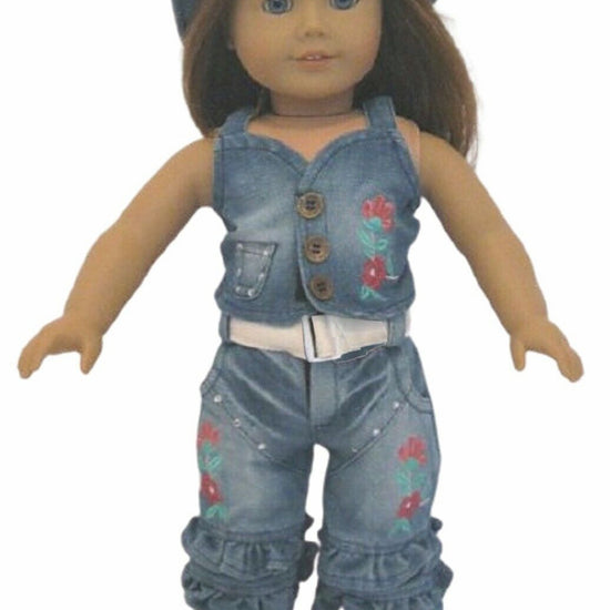 This playful Embroidered Denim Outfit for your doll features a sleeveless top, ruffled capri jeans, a white belt, and a matching hat. Perfect for casual adventures and stylish doll play, it adds fun and flair to any doll’s wardrobe!