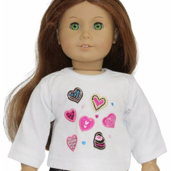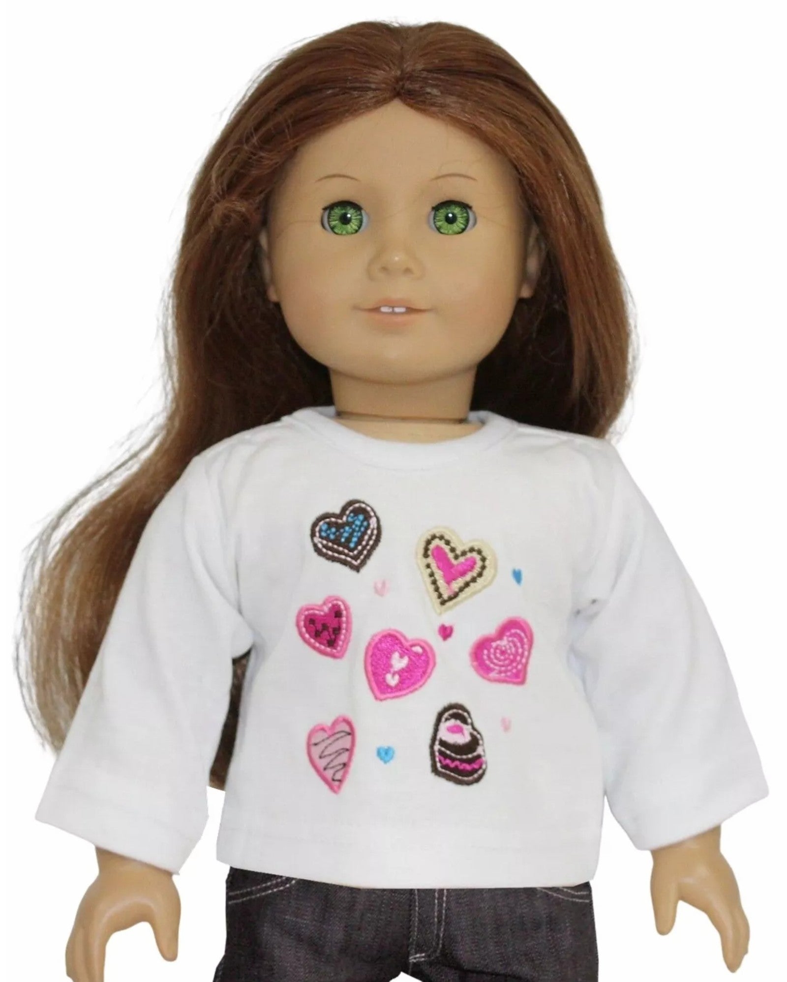 Spread the love with this sweet White Long Sleeve Tee featuring delicate embroidered hearts! Perfectly sized for 18" American Girl dolls, this cozy top showcases charming heart details that add a touch of warmth to any outfit. The convenient back Velcro closure makes dressing a breeze. Your doll will adore this heartfelt essential for her everyday adventures!