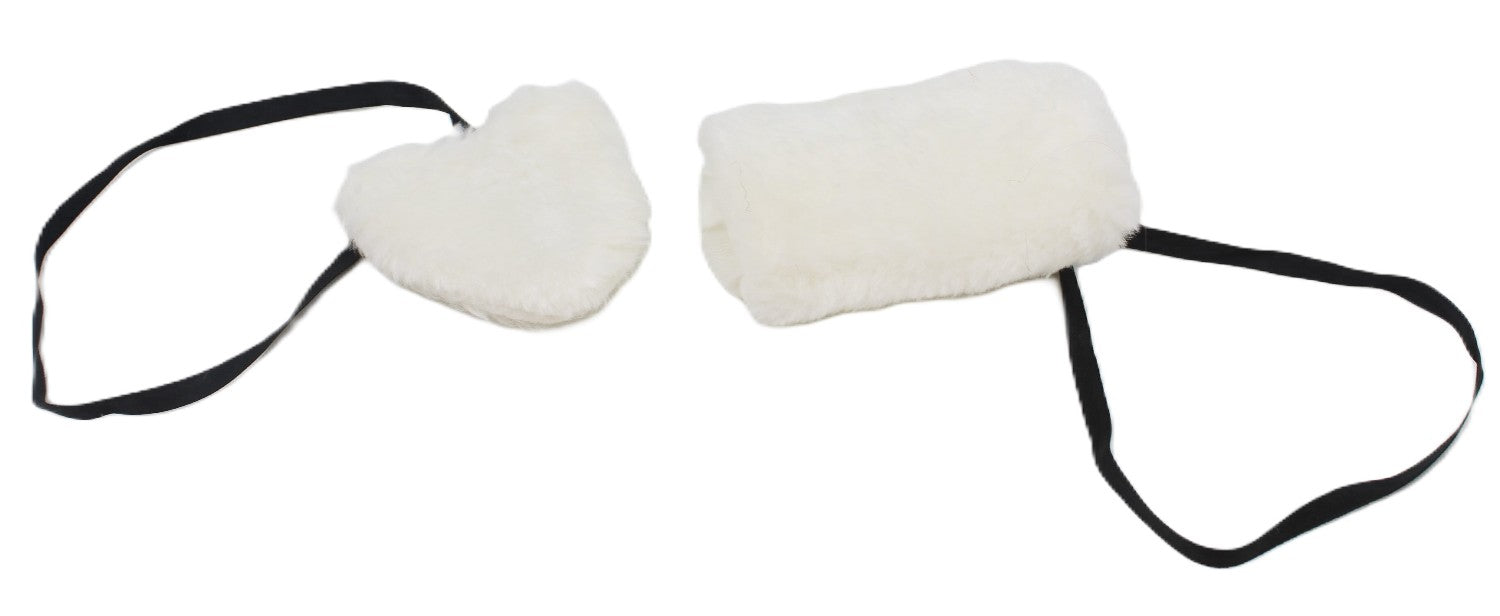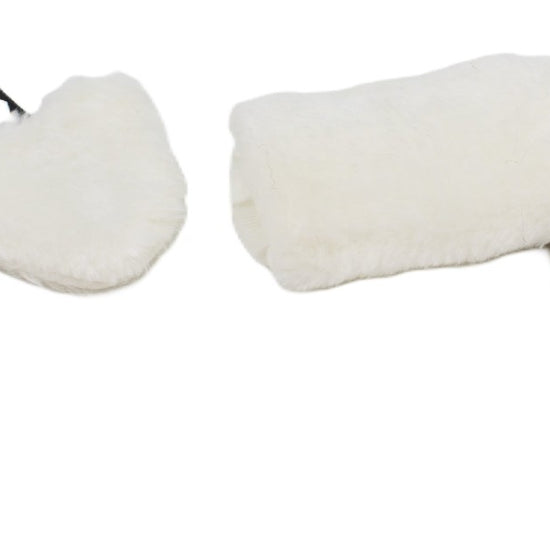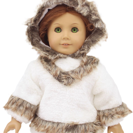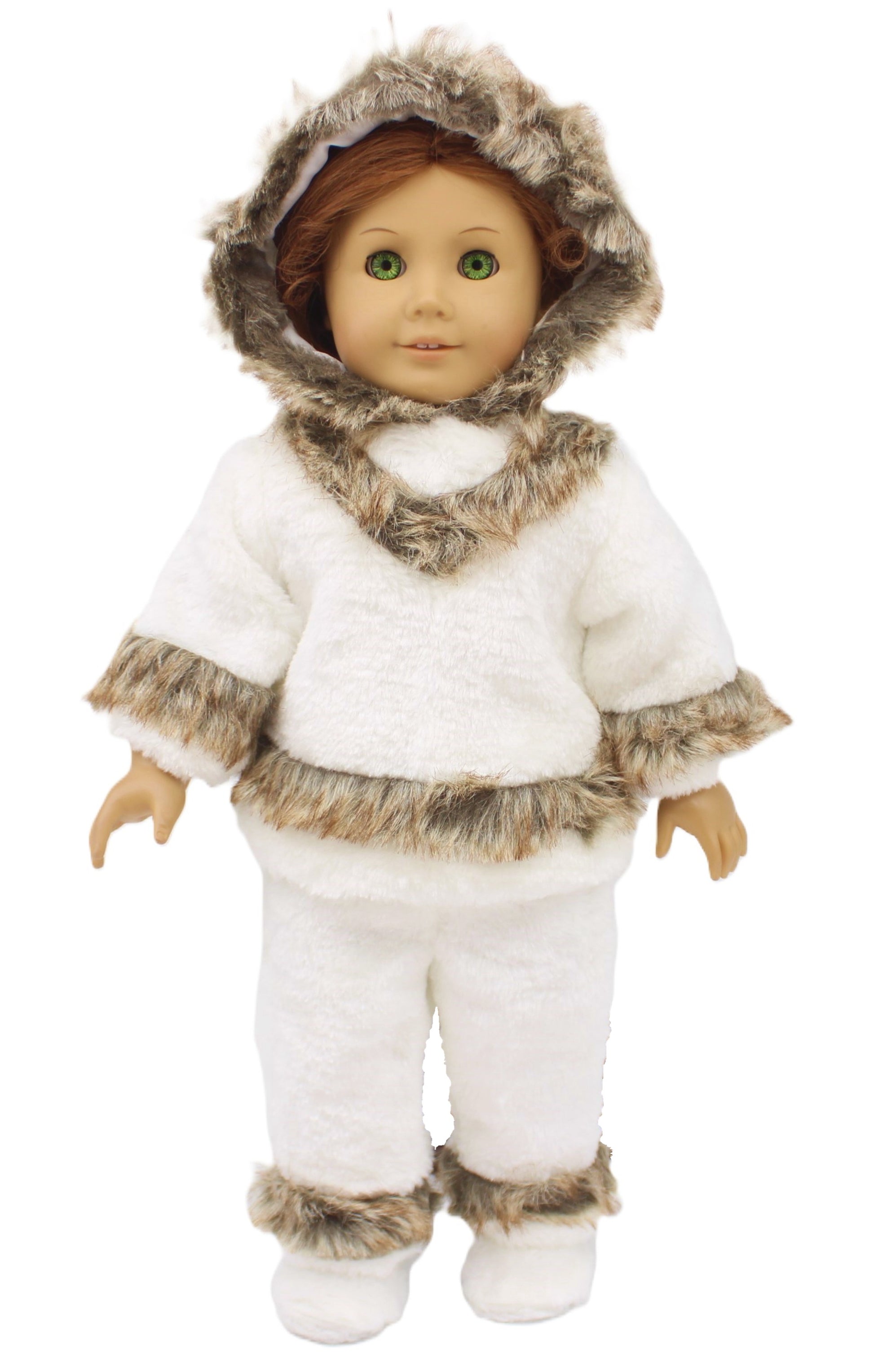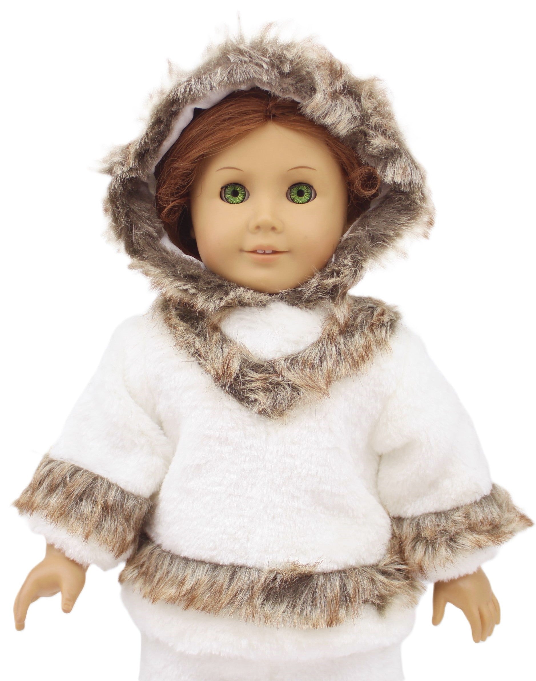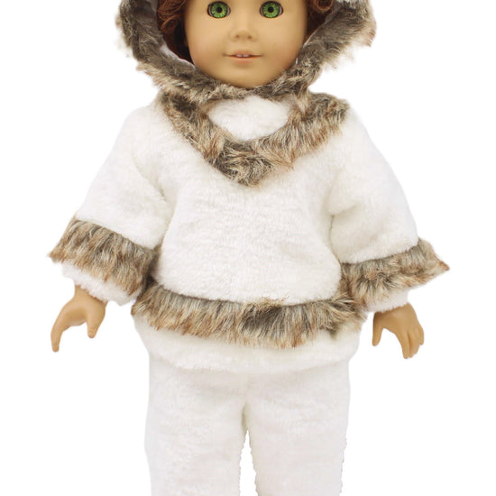 Eskimo faux fur lined winter parka with hood, pants, boots (tight fit), muff and purse.