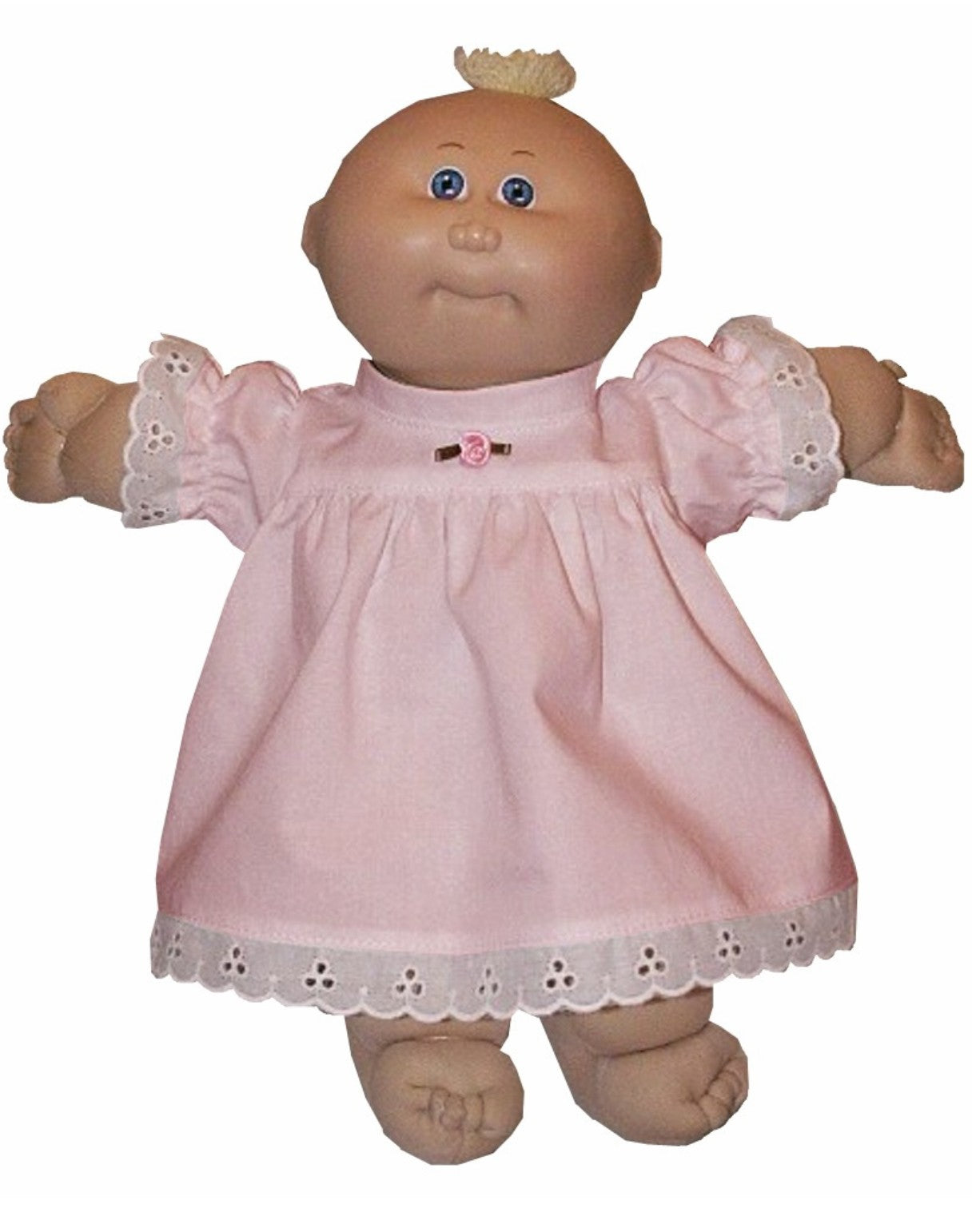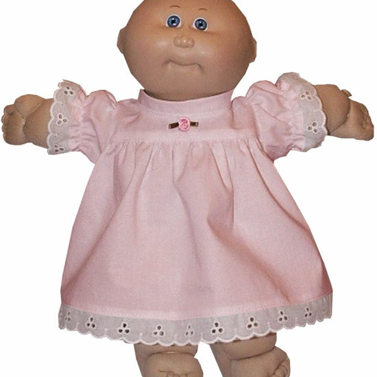 Charming eyelet lace dress designed for 14" CPK Preemie dolls. Features a crisp stand-up collar and delicate eyelet trim along the sleeve and skirt hems in coordinating white or ivory. Choose between short or long sleeves to match your doll's style. Convenient back Velcro closure makes dressing easy. A timeless piece that brings vintage-inspired elegance to any doll wardrobe.