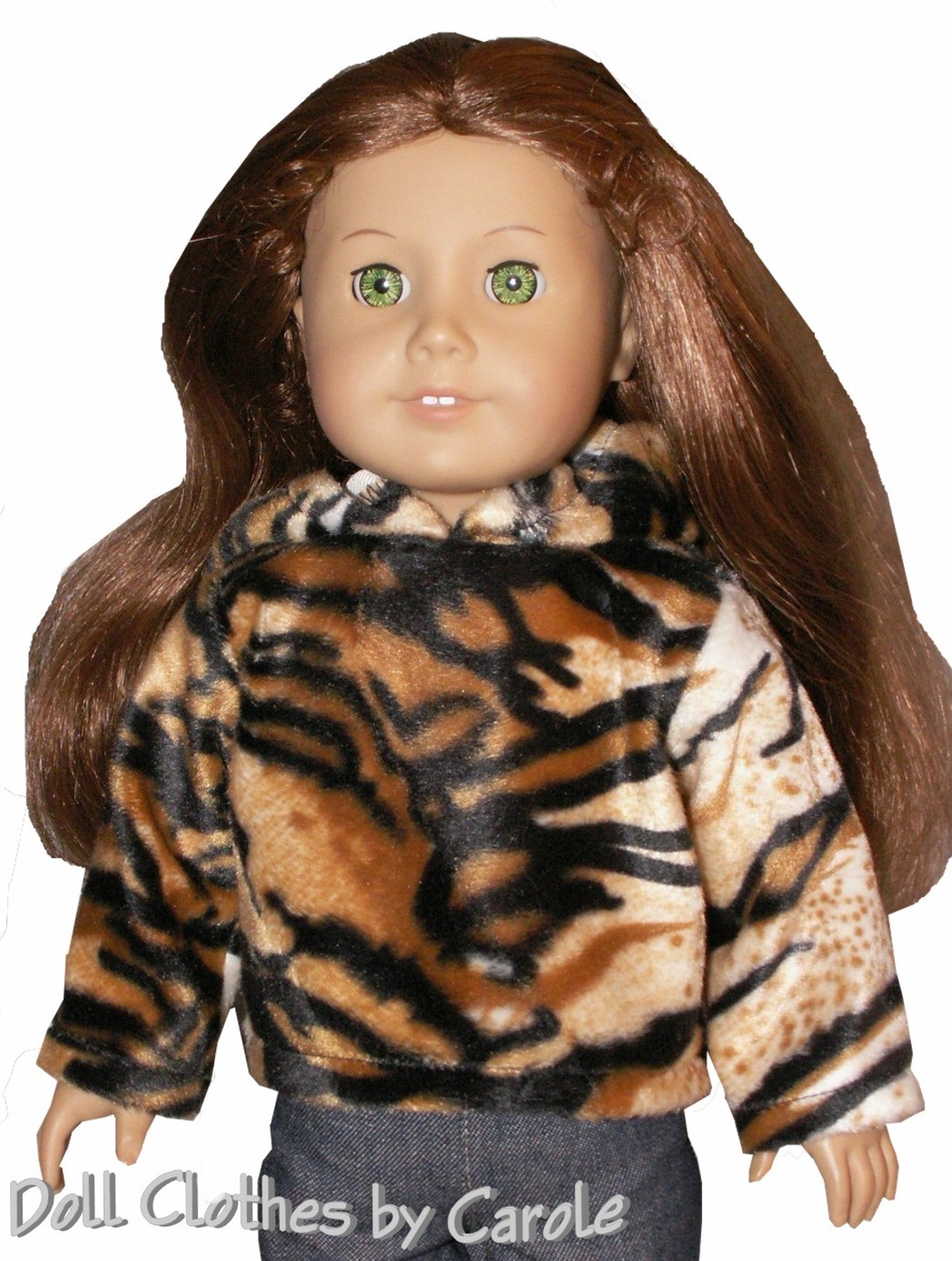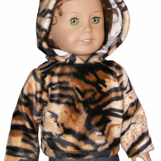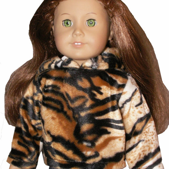 This playful faux tiger or leopard fur hoodie fits American Girl dolls perfectly. It opens fully in the back and closes with Velcro, making it easy to dress your doll while adding a fun, wild style to her outfit.