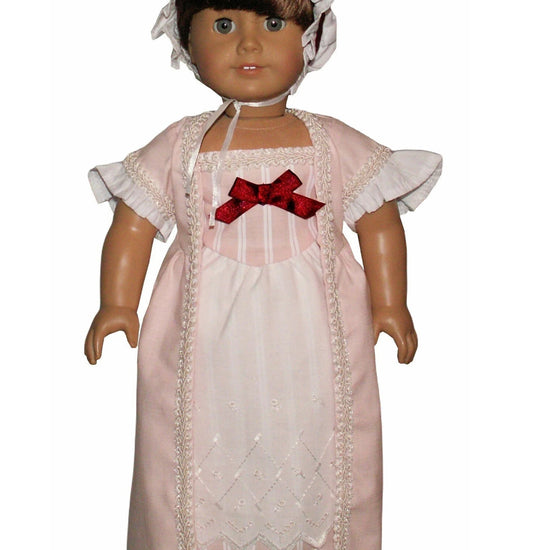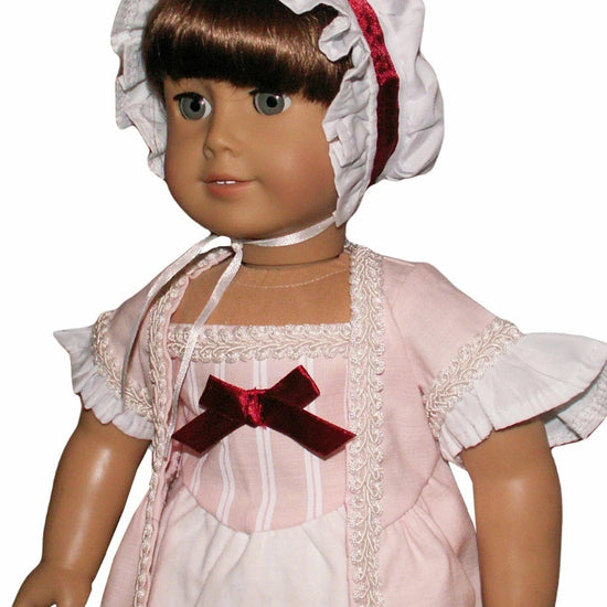 Step into history with this charming colonial-inspired day dress, perfect for your American Girl doll! Featuring soft pink tones and authentic period details, this Felicity-inspired design captures the elegance of 18th-century fashion. The sweet cap completes the look with historical accuracy and delightful charm. Your doll will be ready for tea time, adventures, or display in this timeless ensemble that brings the past to life!