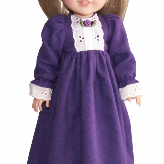 Cozy dreams await in this charming flannel nightgown designed for 14" WellieWishers dolls. Delicate white lace adorns the bodice front and sleeve hems, adding a touch of elegance to the soft, gathered skirt. The convenient back Velcro closure makes dressing playtime quick and easy. Perfect for bedtime adventures and sleepover scenarios!