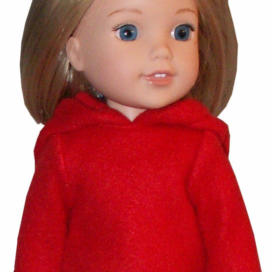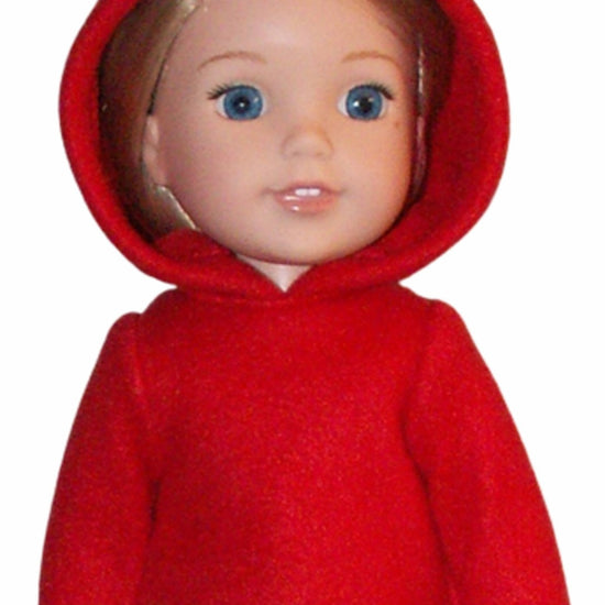Pullover hooded fleece top has long sleeves and fully opens in back for easy doll dressing.