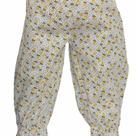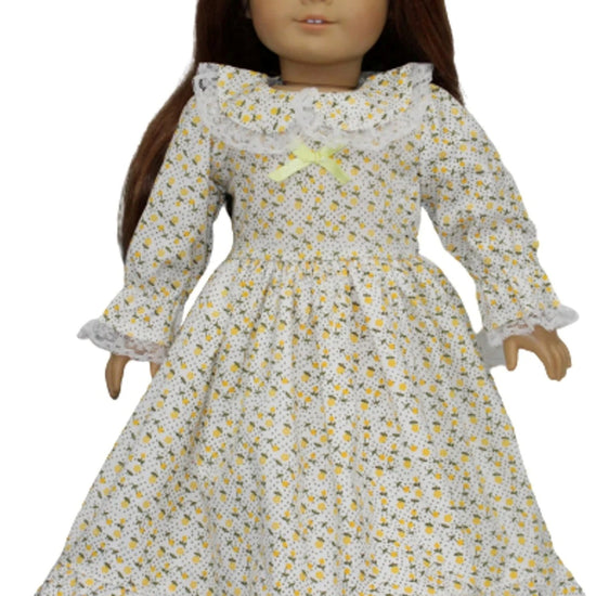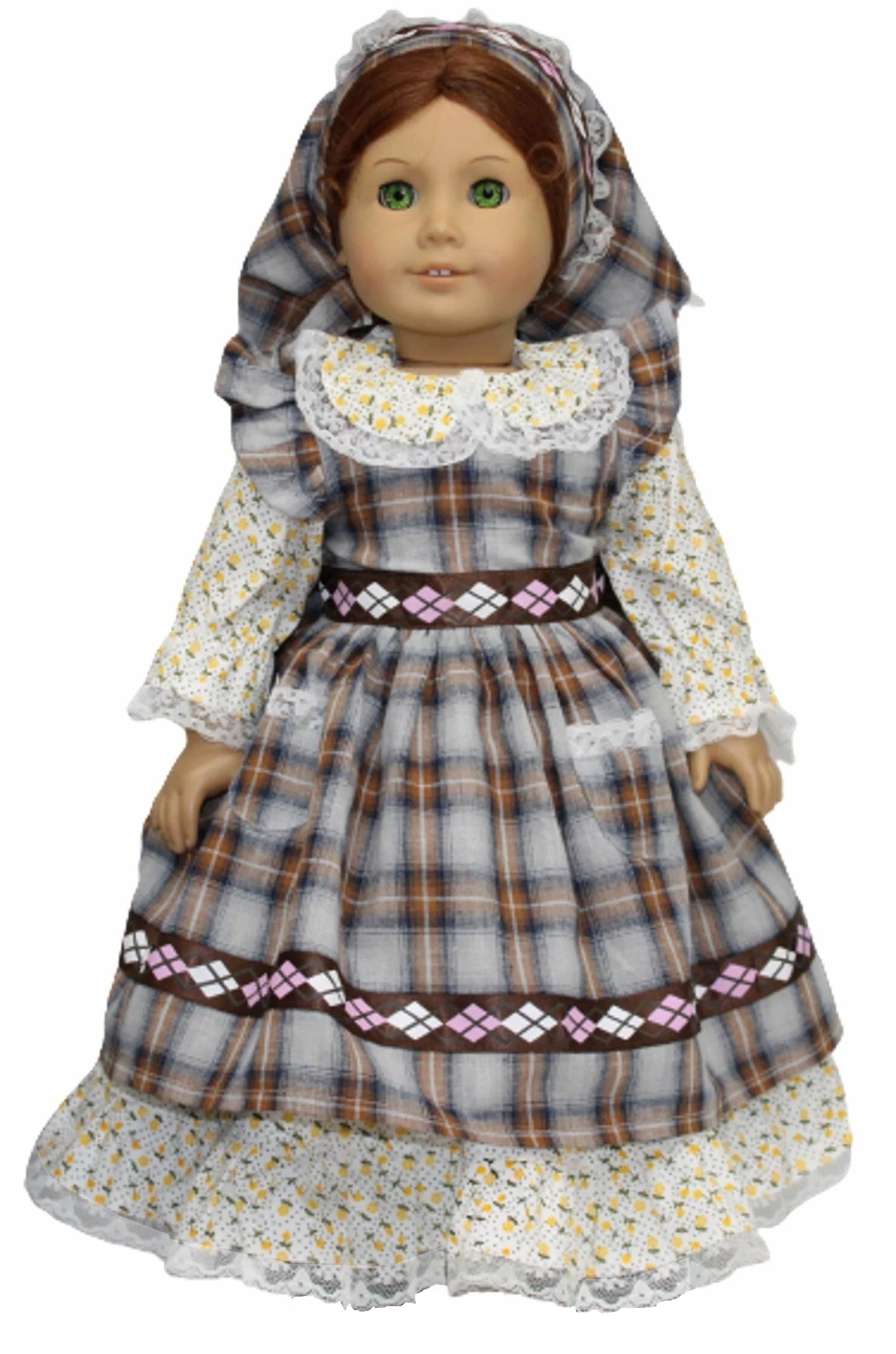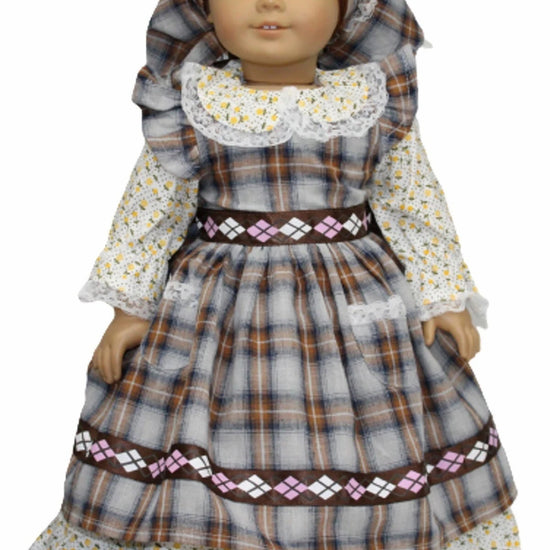 Beautiful floral dress with matching pantaloons and a plaid long apron with head scarf. This is a very full skirt, and a gorgeous outfit.