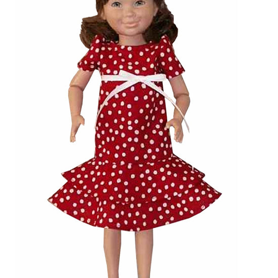 Designed for 16" Hopscotch Hill dolls, this charming flounced skirt dress features short gathered sleeves and a double-layered skirt with elegant ruffles. A delicate ribbon accent adds a finishing touch, while a convenient Velcro closure at the back makes dressing your doll quick and easy. Perfect for everyday play or special occasions.