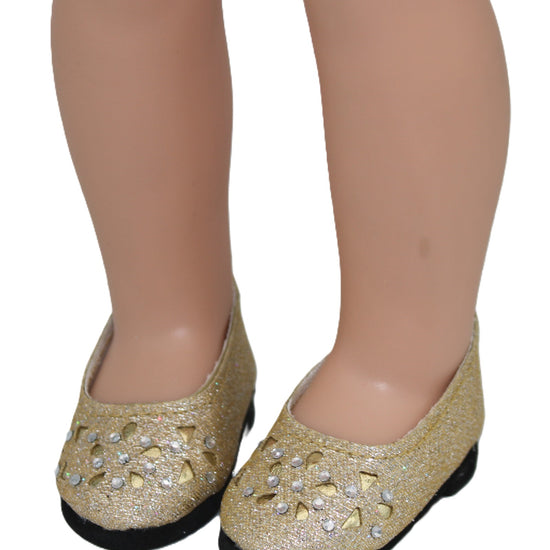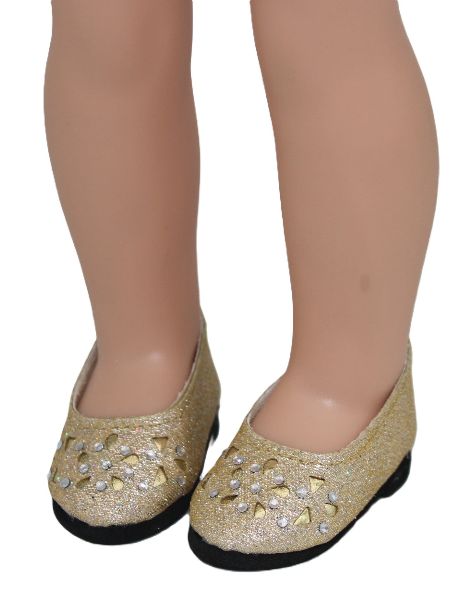 Add sparkle to your WellieWishers doll’s outfit with these gold flats adorned with rhinestone accents. Designed to fit 14.5" dolls perfectly, these shiny shoes bring a playful touch of glamour to every adventure. Easy to slip on and off, they’re the perfect finishing detail for your doll’s stylish look.