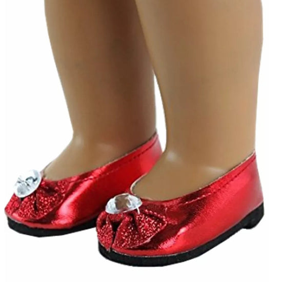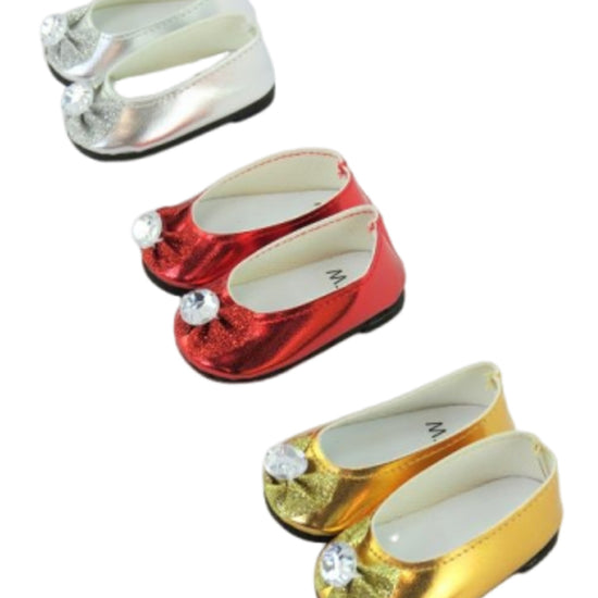 Gold, red or silver metallic Flats w/ Jewel bring instant glamour to your doll's wardrobe! These slip-on flats feature a shimmering gold metallic finish with an elegant bow and sparkling jewel detail. Perfect for dressing up your American Girl doll for special occasions or everyday elegance. Watch her shine with every step!