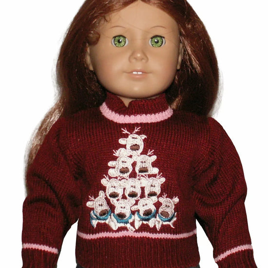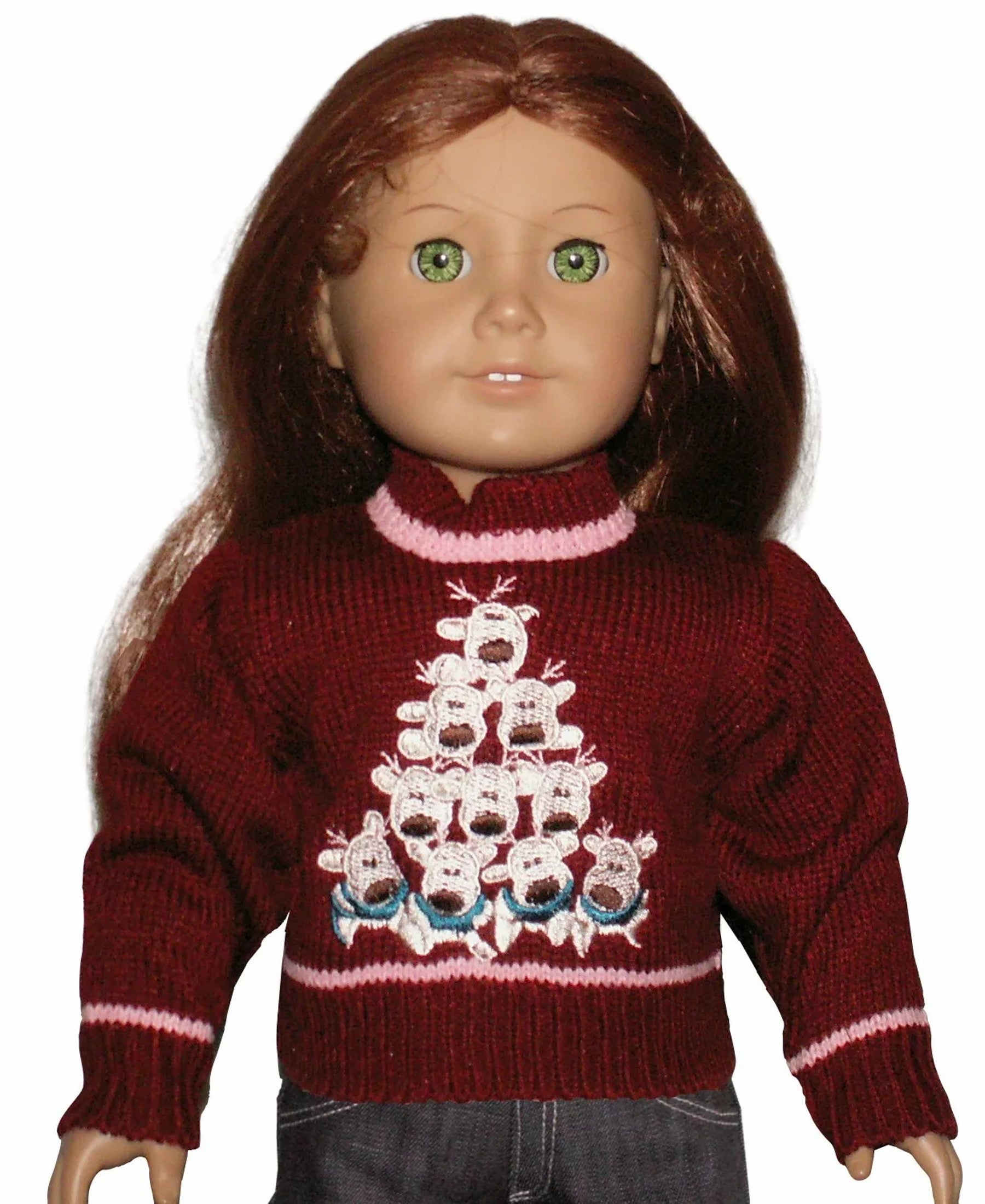 Burgundy Christmas sweater with embroidered "Pile of Reindeer" closes in back with snaps.