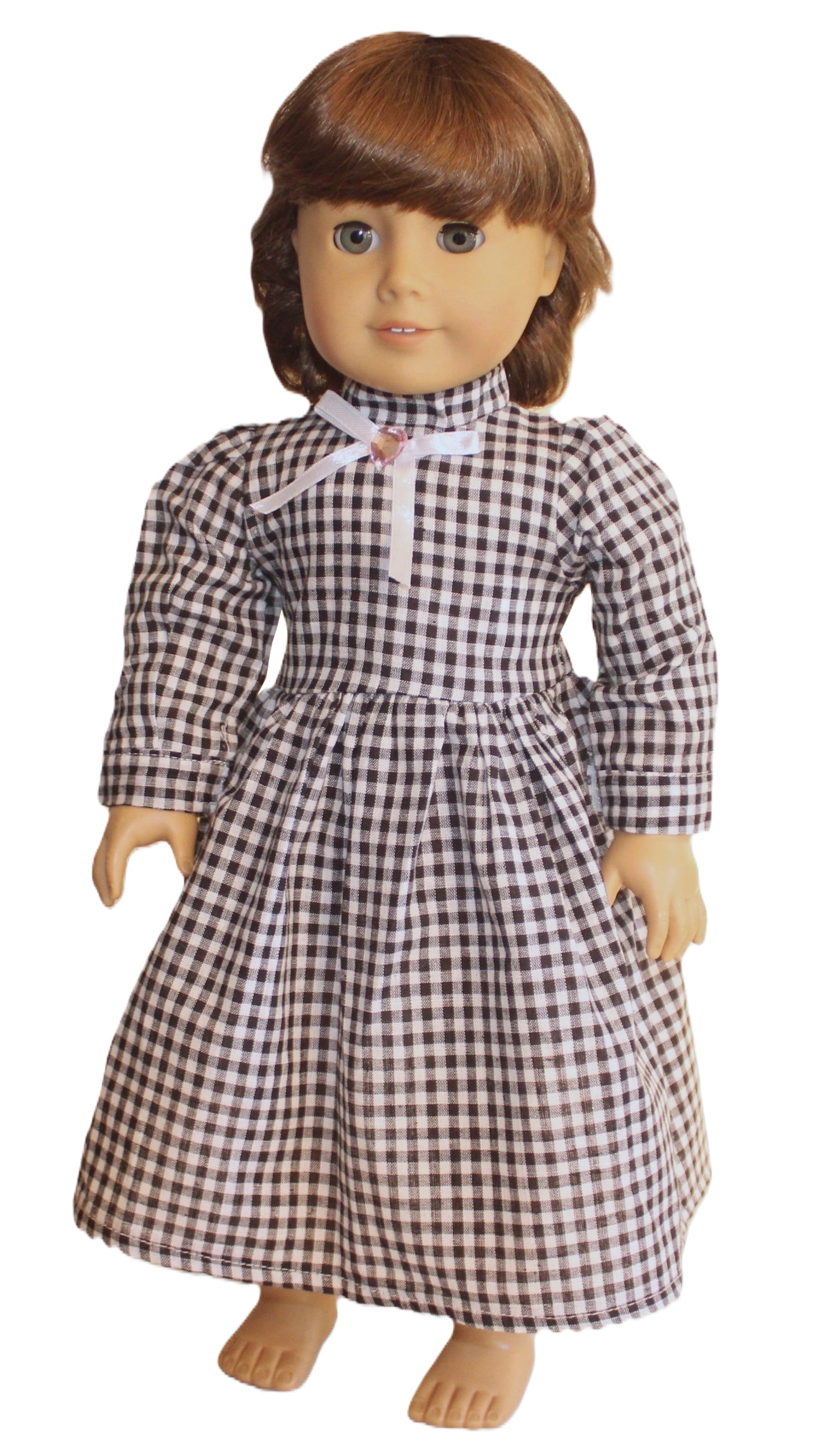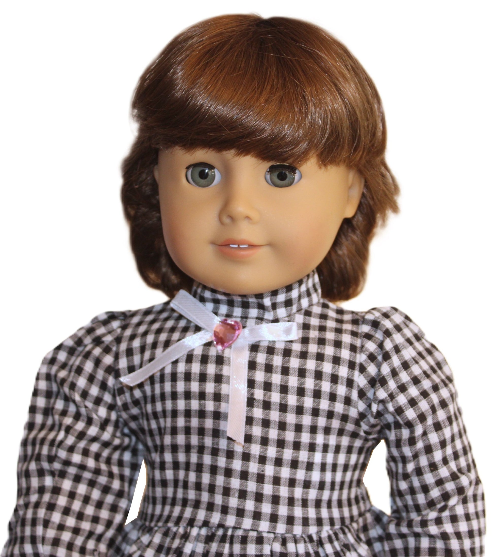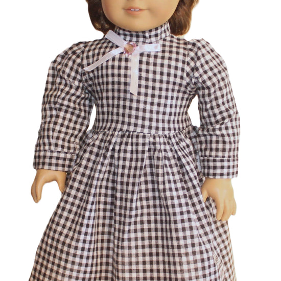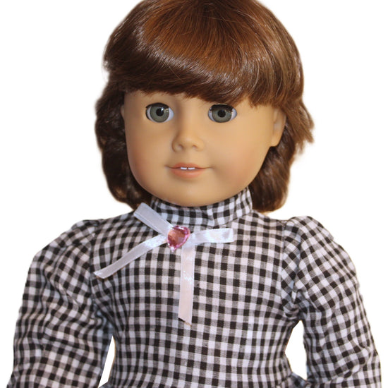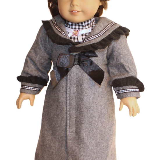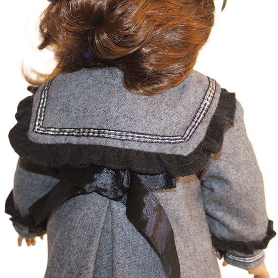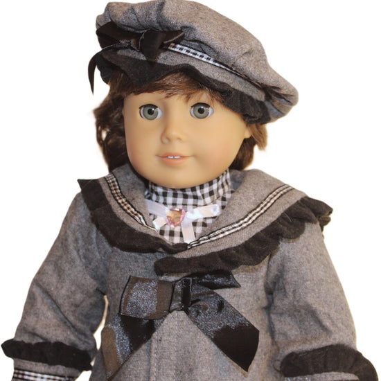 Wrap your doll in timeless charm with this Gray Victorian Coat & Dress set. The soft gray wool coat, detailed with sleek black trim, pairs perfectly with the matching hat for an elegant Victorian look. Beneath, a playful black gingham dress adds a touch of whimsy, making this outfit ideal for doll adventures through history or imaginative play.