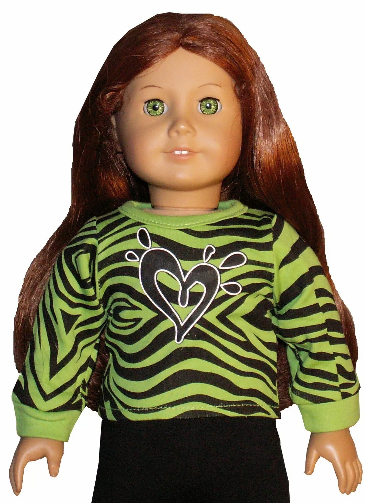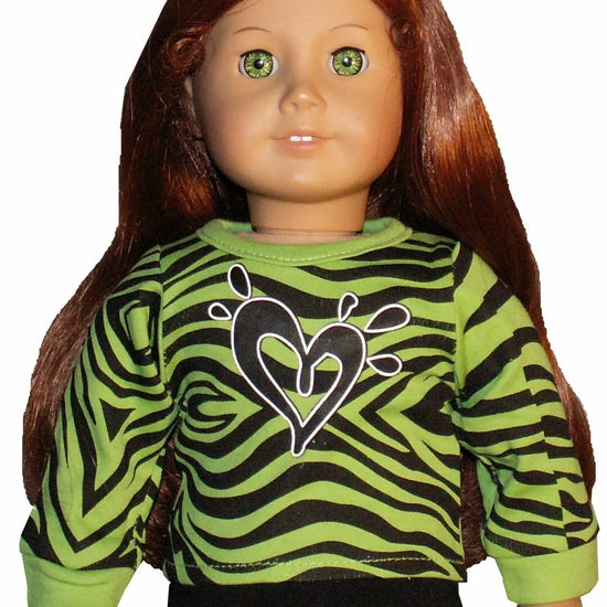 Green long sleeve tee with a heart on black zebra print closes in back with Velcro.