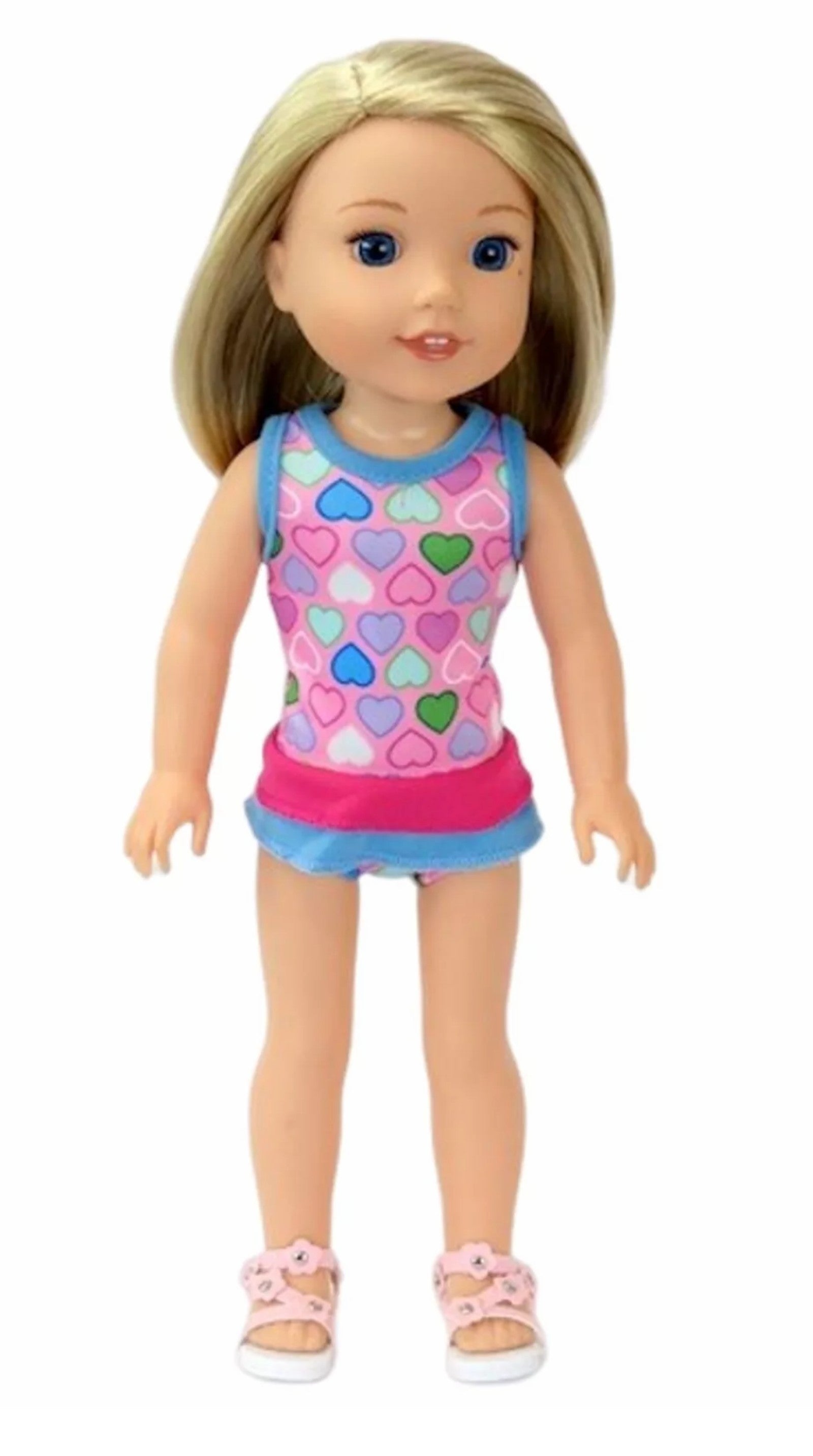 Enjoy a day at the beach with this heart printed bathing suit with a ruffle detail.