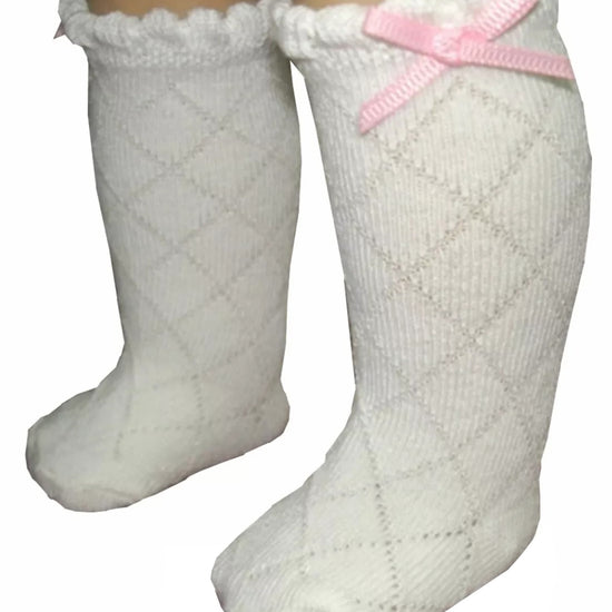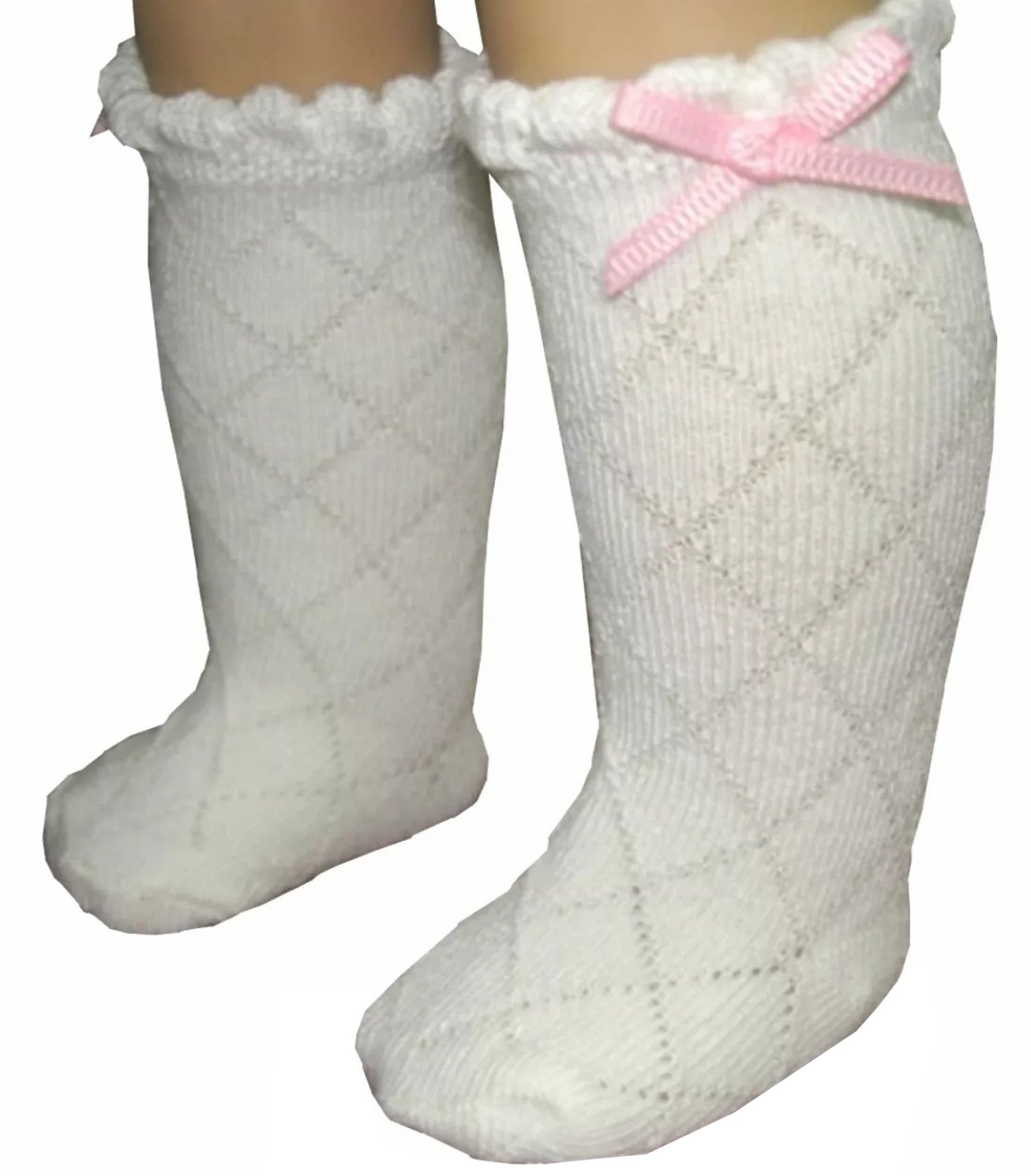 White diamond pattern knee high socks with pink bows fit most dolls 15-20" with average size feet.