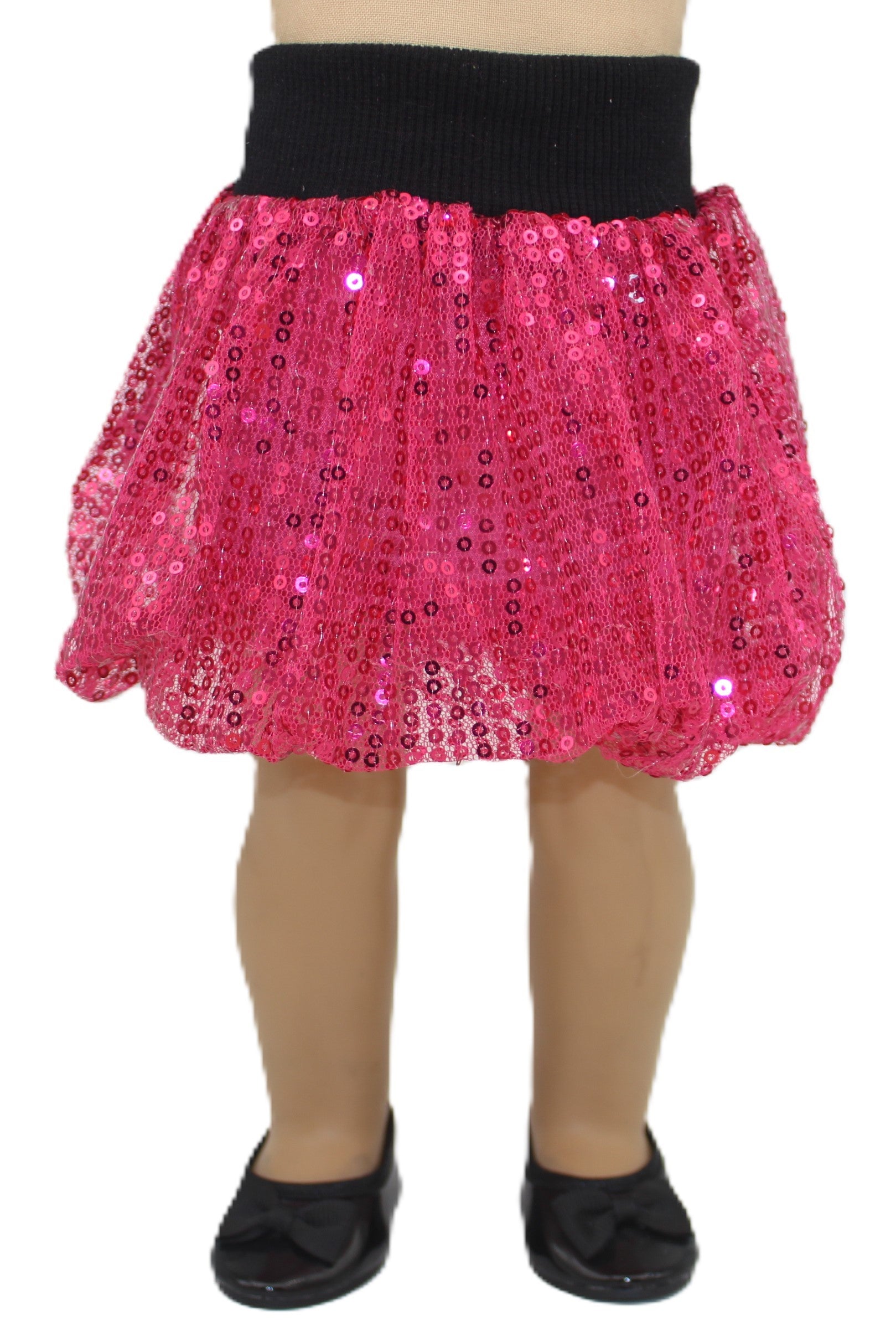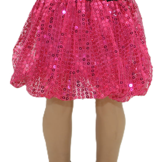 Hot pink sequin bubble skirt has a black knit waistband and is lined.